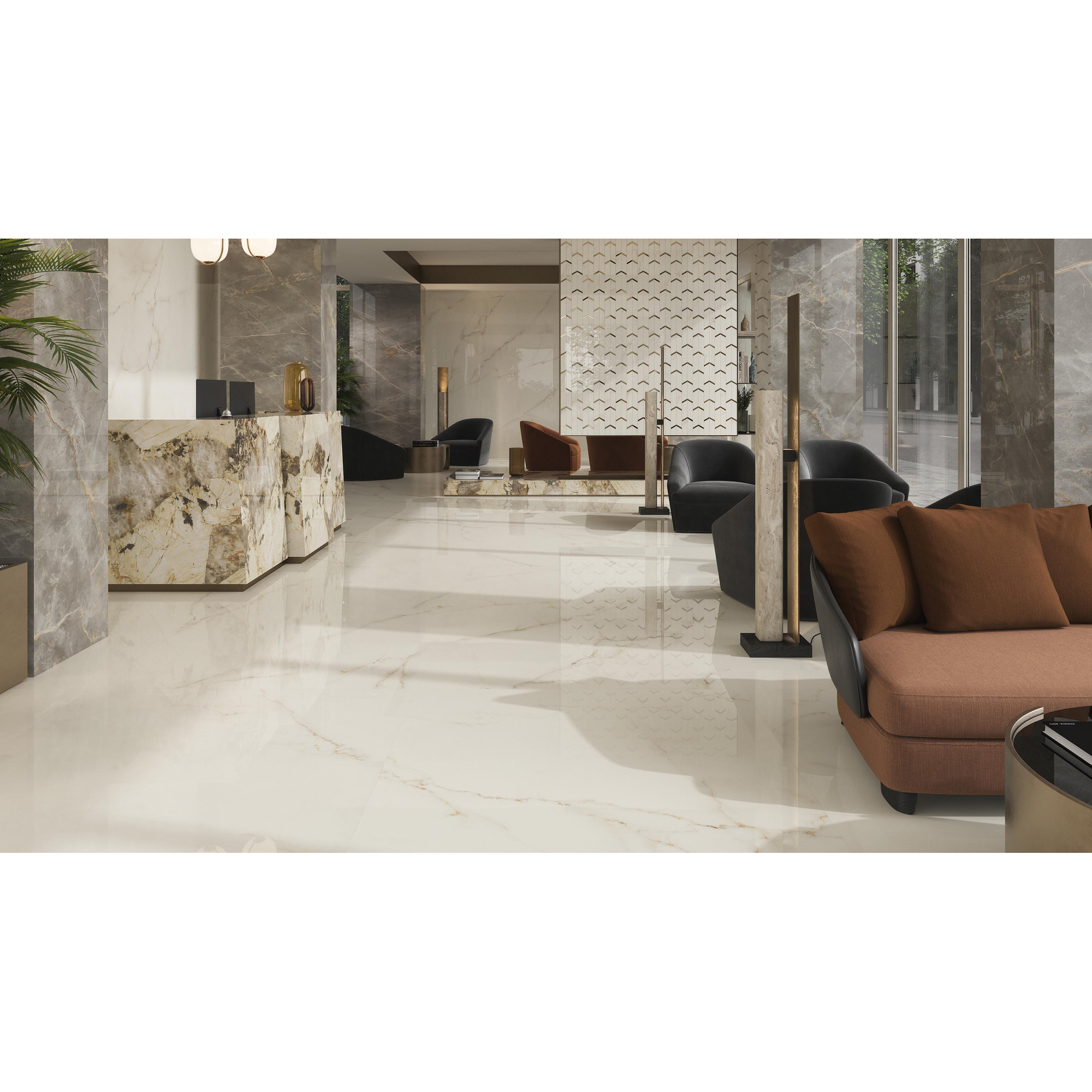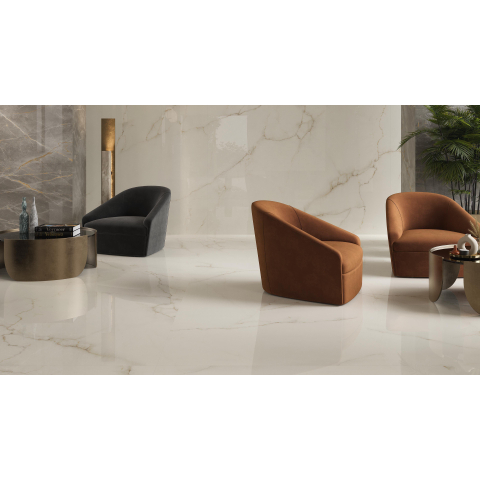 L’effet marbre de ce carreau est inspiré d’un matériau Calacatta raffiné : une base claire avec de élégantes veines parcourant la surface. La finition brillante renforce la profondeur et les nuances du décor, donnant au sol une apparence de marbre presque naturelle. En combinaison avec le grand format, il en résulte un ensemble sobre et chic qui s’accorde parfaitement avec une douche à l’italienne moderne, une baignoire autoportante ou un meuble minimaliste. La haute brillance reflète la lumière dans la pièce, ce qui fait paraître votre salle de bains, votre hall ou votre salon optiquement plus grand et plus lumineux. Vous profitez ainsi de l’apparence de la pierre naturelle exclusive, mais avec la sécurité et la prévisibilité de la céramique.Grand format pour un ensemble spacieux et presque sans joints
