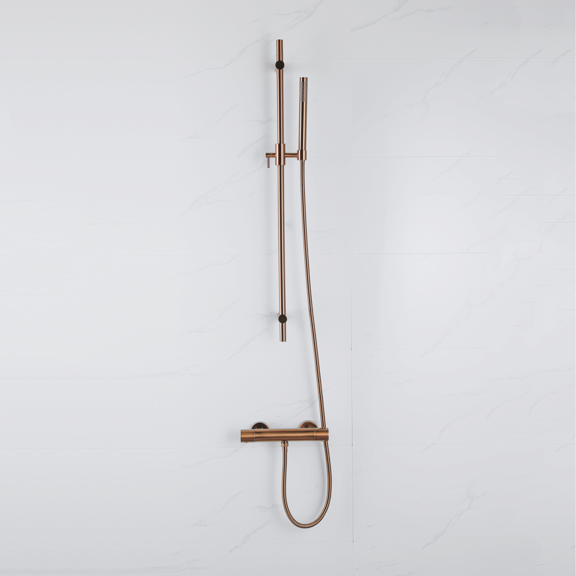 La finition couleur cuivre brossé donne immédiatement à votre douche une apparence chaleureuse et luxueuse. Contrairement au chrome standard, cette finition apporte plus d’ambiance et de caractère, sans être trop tape-à-l’œil. La surface mate et brossée se combine parfaitement avec les tons naturels, les carreaux effet béton et les accents noirs, mais aussi avec le marbre ou la céramique claire. Comme la barre de douche présente un design fin, elle a un aspect subtil et raffiné, ce qui fait qu’elle ne domine pas mais complète justement l’ensemble. Si vous optez pour un look uniforme dans la salle de bains, cette couleur s’accorde parfaitement avec les autres robinets et accessoires en cuivre PVD, afin de créer un ensemble harmonieux et bien pensé.