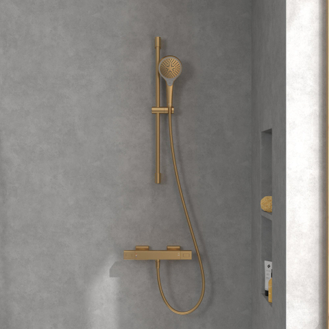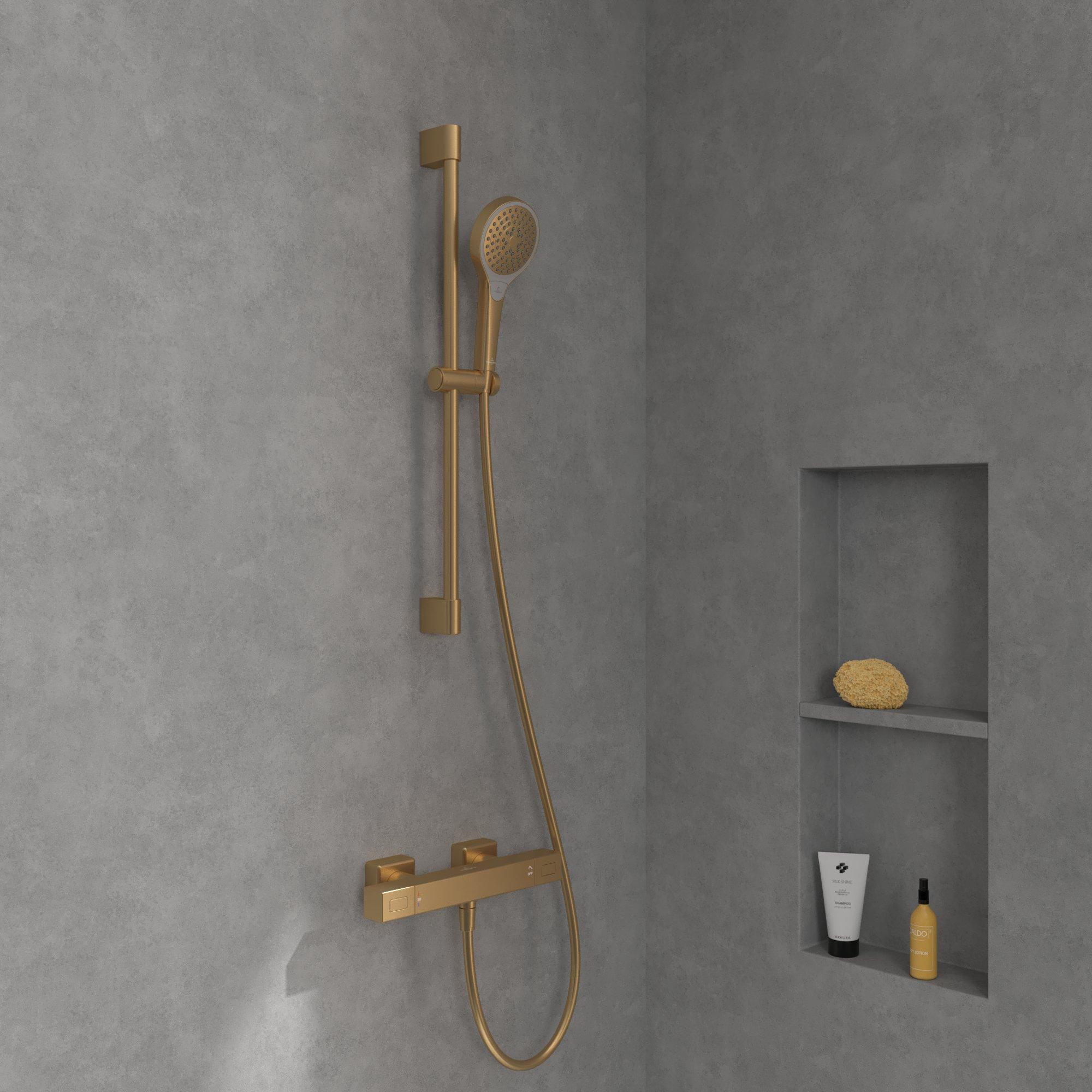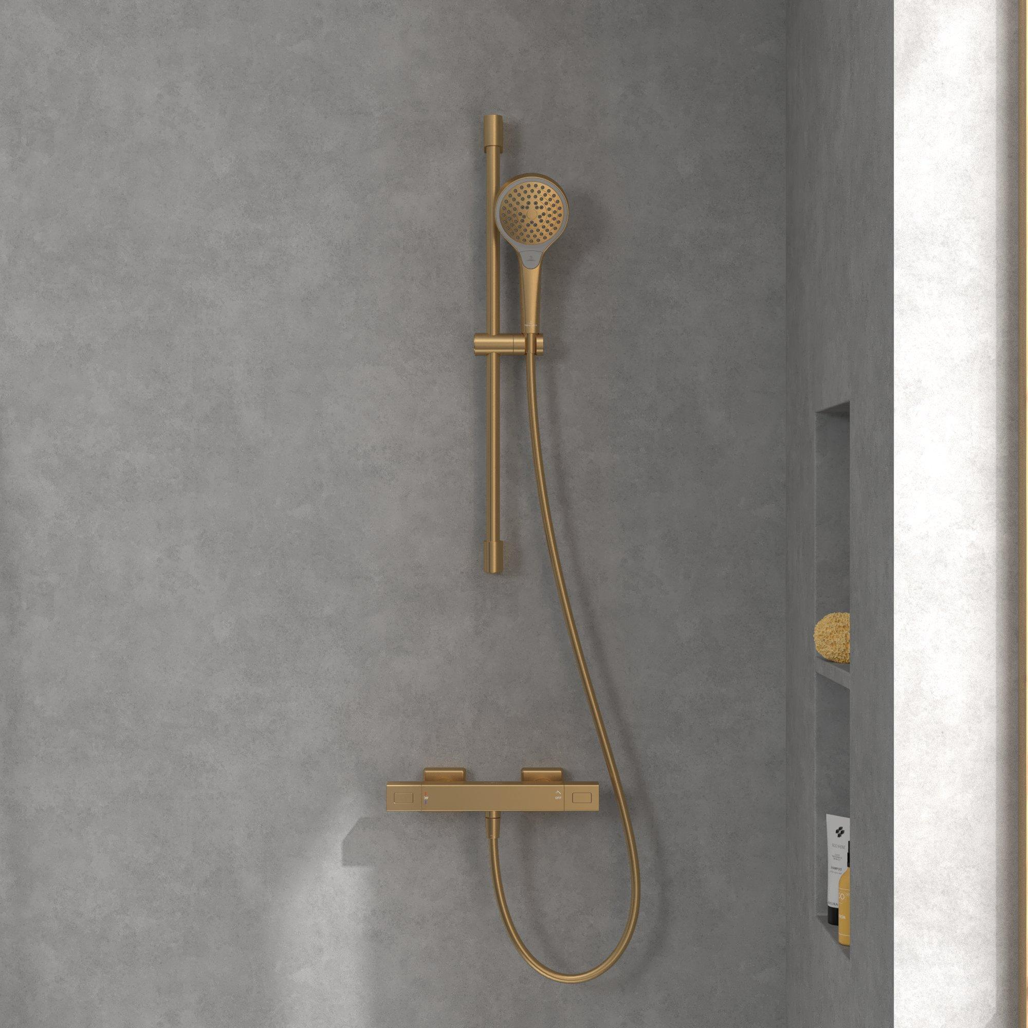 Ce mitigeur thermostatique de douche luxueux en or brossé est le choix idéal si vous souhaitez donner à votre espace de douche une apparence haut de gamme digne d’un hôtel, sans faire de compromis sur le confort et la sécurité. Sa forme angulaire et épurée s’intègre parfaitement dans les salles de bains modernes et design, mais se combine également très bien, grâce à la teinte dorée chaleureuse, avec un style classique ou chic. Grâce à la commande thermostatique, vous profitez chaque jour d’une température d’eau constante et confortable, même si quelqu’un ouvre un robinet ailleurs dans la maison. Cela rend ce produit particulièrement adapté aux familles occupées, aux amateurs de design et à tous ceux qui souhaitent hisser leur salle de bains existante à un niveau supérieur en une seule fois avec un mitigeur apparent pour douche à la fois élégant et fonctionnel.
