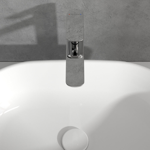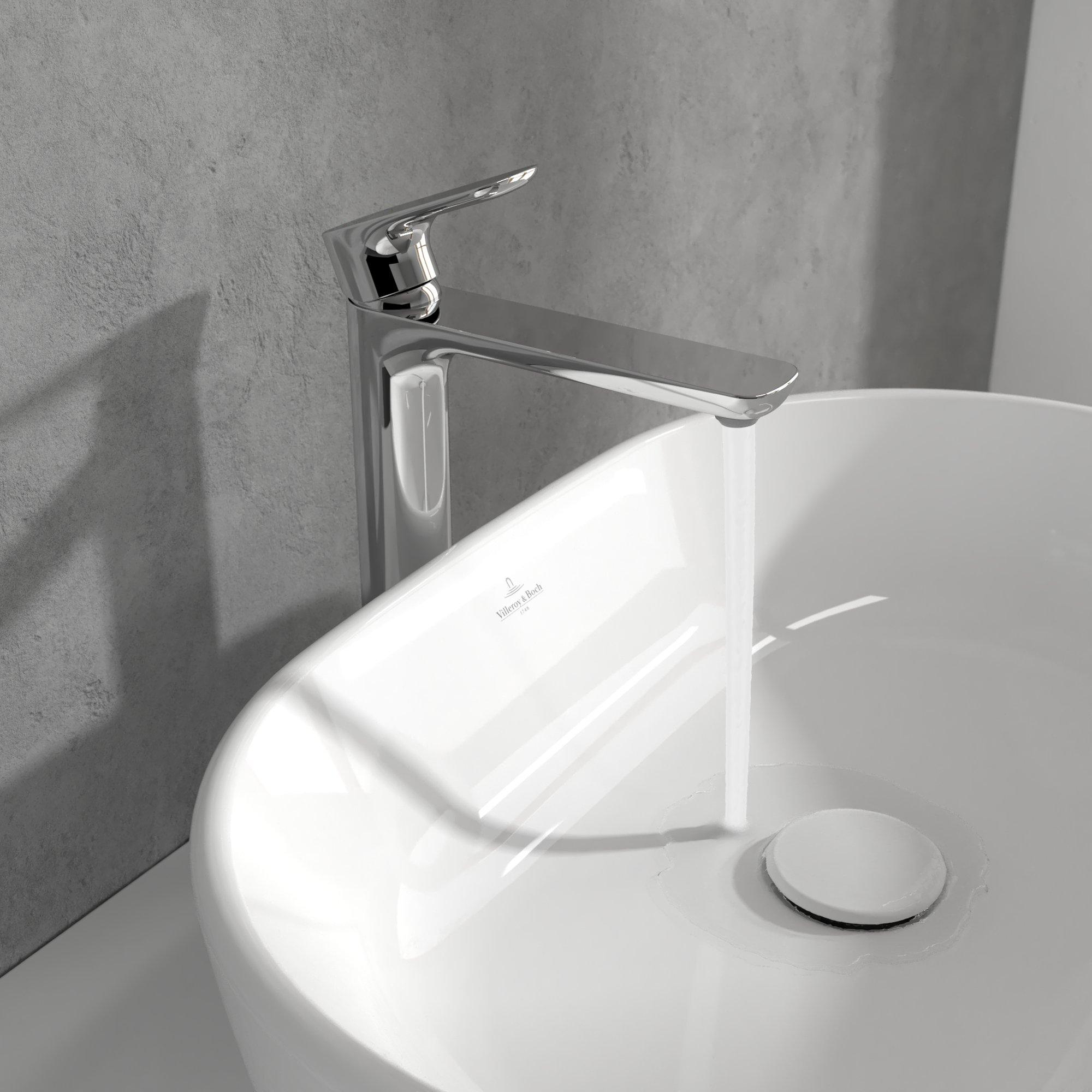 - Mitigeur de lavabo surélevé, idéal en combinaison avec des vasques à poser et des lavabos plus hauts pour une liberté de mouvement accrue.