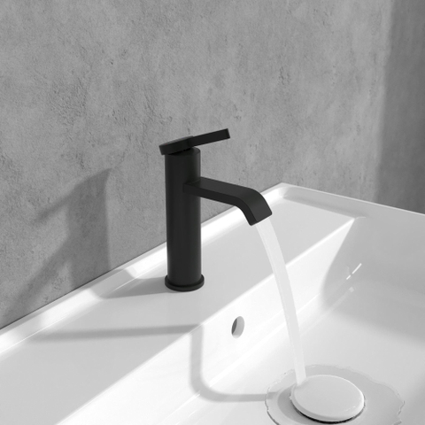 - Mitigeur de lavabo élégant à levier unique en noir mat, idéal pour les salles de bains modernes et design.