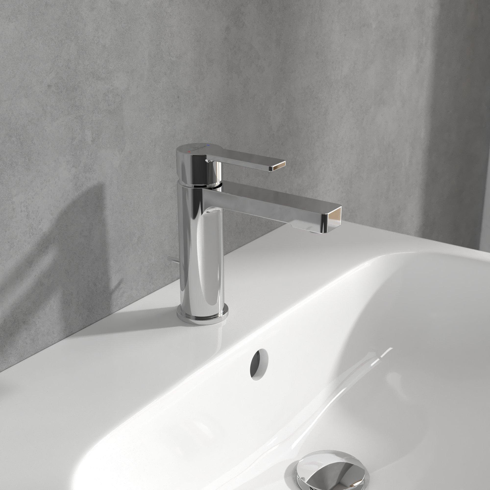 La combinaison de contours fins, d’un bec plat et de la finition chromée brillante donne un robinet qui confère immédiatement une allure luxueuse à votre lavabo. Avec une hauteur totale d’environ 164 mm et un bec qui atteint environ 124 mm, il offre suffisamment d’espace pour se laver les mains ou remplir un verre, sans provoquer inutilement d’éclaboussures d’eau. Les proportions ont été soigneusement choisies, de sorte que le robinet soit bien équilibré sur la plupart des lavabos standards et lavabos-meubles. Vous obtenez ainsi un ensemble élégant où la forme et la fonction se renforcent mutuellement, idéal si vous souhaitez que votre salle de bains suive une ligne globale calme et réfléchie.