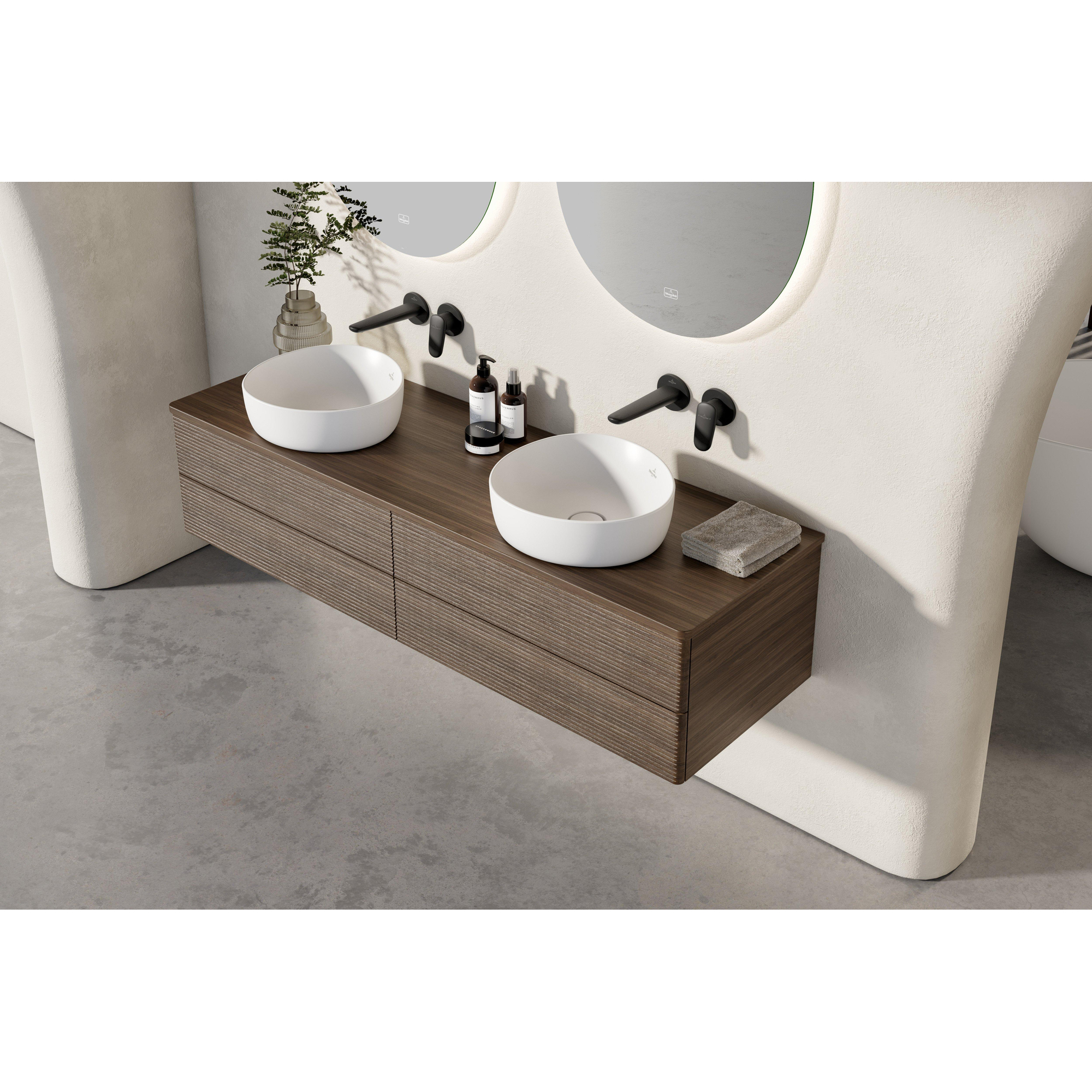 Avec le montage mural à deux trous, vous créez un look minimaliste : vous ne voyez que le bec de forme organique et la poignée subtilement placée, ce qui donne à l’ensemble un aspect à la fois apaisant et particulier. Les formes rondes et les lignes douces s’accordent parfaitement avec les lavabos et vasques ovales ou ronds, mais offrent aussi un contraste intéressant avec les modèles plus rectangulaires et épurés. La couleur noire mate apporte une touche contemporaine et luxueuse et se combine à merveille avec des accents noirs tels que colonnes de douche, accessoires ou profils de miroir. Comme vous intégrez le robinet dans le mur, le plan de lavabo reste dégagé et facile à nettoyer, ce qui est particulièrement appréciable dans les foyers occupés ou pour une salle de bains au style hôtelier épuré.