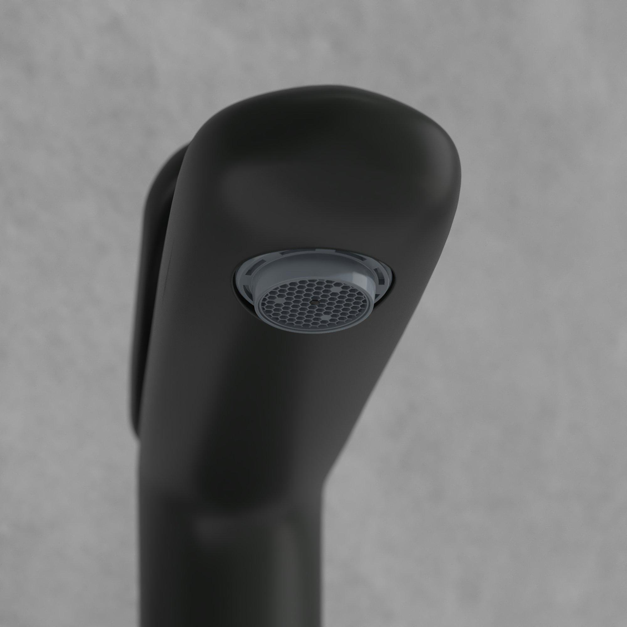 Le design organique aux lignes douces et à la forme asymétrique est inspiré d’une goutte de rosée, ce qui fait que ce robinet attire immédiatement le regard sans être criard. La finition noire mate offre un aspect luxueux et contemporain qui se marie parfaitement avec les lavabos clairs, la pierre naturelle ou l’effet béton. Grâce à l’exécution surélevée, le robinet met particulièrement en valeur les vasques à poser et crée une impression d’espace autour de la vasque. La position originale de la poignée souligne le caractère design et fait de ce robinet un véritable point de mire sur votre meuble de salle de bains. Vous ajoutez ainsi avec un seul produit à la fois du style et de la fonctionnalité à votre salle de bains.