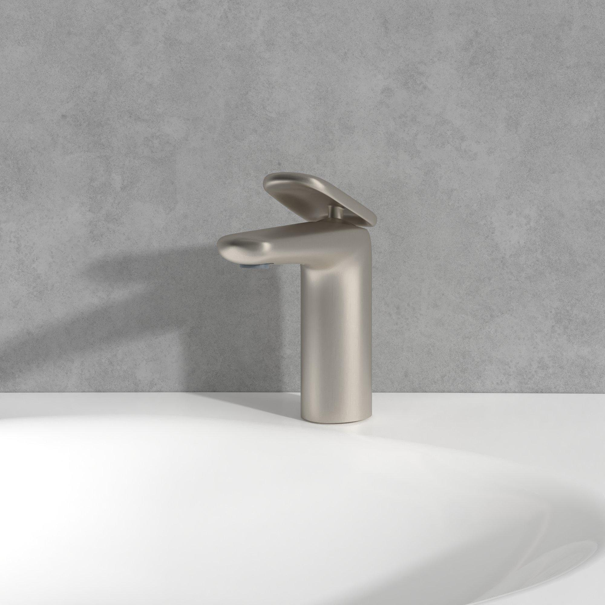 La forme est inspirée d’une goutte de rosée, ce qui se retrouve immédiatement dans les lignes douces et asymétriques ainsi que dans la position particulière de la manette. Il en résulte un robinet non seulement fonctionnel, mais qui constitue également une véritable déclaration de design sur votre lavabo. La couleur nickel brossé mat (aspect inox) offre une brillance chaude et chic sans être dominante, idéale si vous visez une atmosphère harmonieuse et sereine dans la salle de bains. La silhouette ronde et élancée se combine sans effort avec des vasques modernes et des lavabos à poser. Comme la commande est subtilement intégrée dans le design, l’ensemble paraît calme et ordonné, ce qui contribue immédiatement à une apparence plus luxueuse de votre meuble de salle de bains.