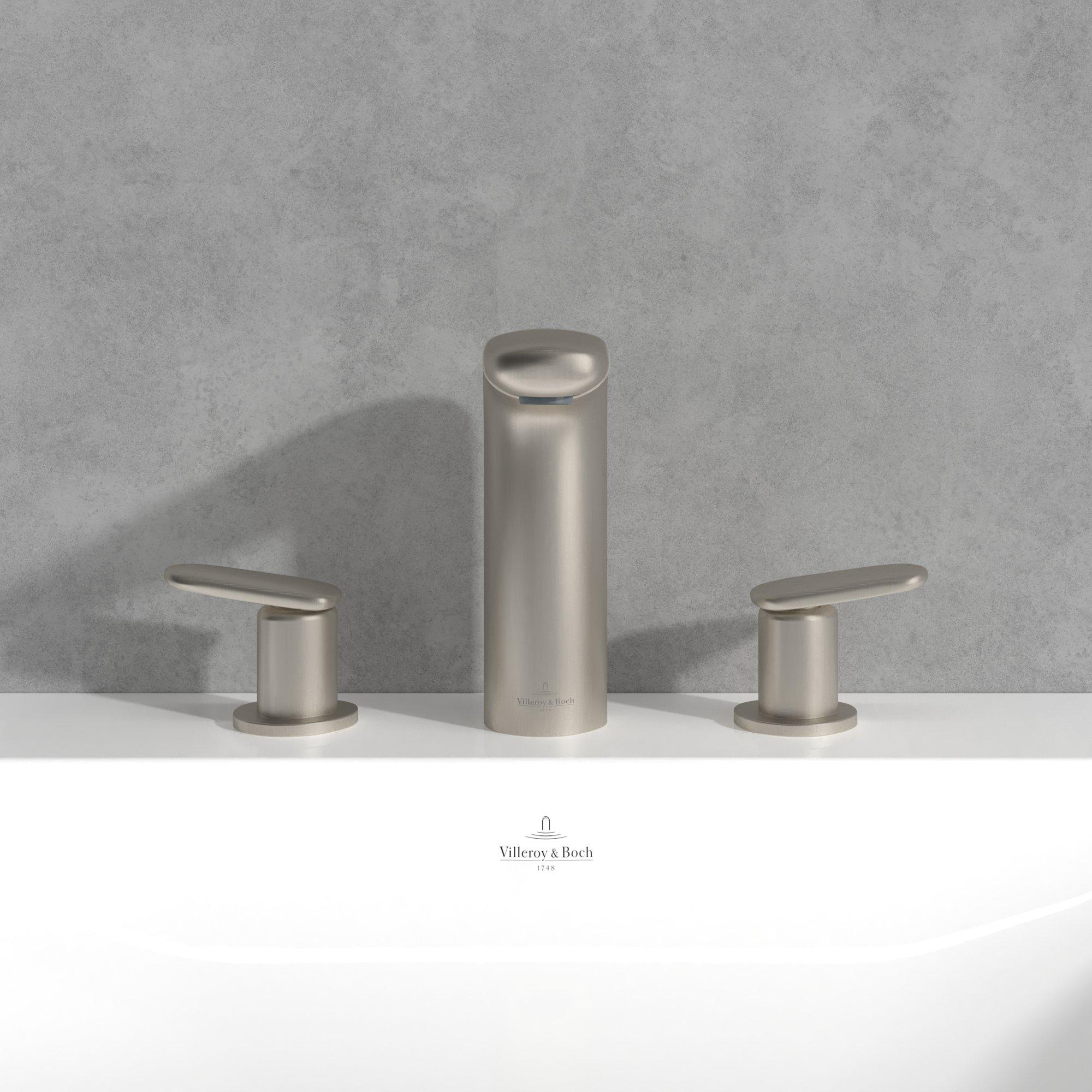 Avec son corps de forme organique et la position marquante de ses deux leviers, ce mitigeur de lavabo à trois trous est un véritable accroche-regard sur votre lavabo. Les lignes arrondies et fluides s'accordent parfaitement avec les salles de bains modernes, naturelles ou scandinaves, mais se marient tout aussi bien avec une ambiance d'hôtel de luxe. La finition nickel brossé mat a l'apparence de l'inox brossé : douce, chaleureuse et intemporelle, sans être criarde. Le robinet s'adapte ainsi aussi bien à un lavabo blanc épuré qu'à un plan vasque en pierre naturelle ou à un meuble plaqué. En optant pour ce design, vous créez immédiatement un ensemble calme et haut de gamme dans lequel chaque détail est soigneusement étudié.