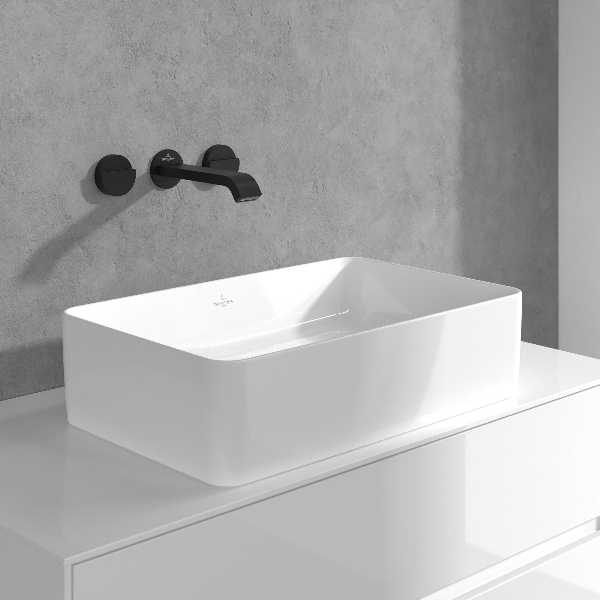 Puisque le bec et les poignées sont montés dans le mur, vous gardez le plan de lavabo libre et l’espace paraît immédiatement plus calme et plus spacieux. C’est particulièrement appréciable dans les salles de bains compactes ou avec un large lavabo à deux vasques, où vous souhaitez limiter au maximum la surcharge visuelle. Les trois trous offrent un look harmonieux et équilibré : le bec au centre, les élégantes poignées rotatives à gauche et à droite. La couleur noire mate ressort magnifiquement aussi bien sur des lavabos et des carreaux blancs que colorés, et se combine facilement avec d’autres accessoires de salle de bains noirs. Vous créez ainsi un jeu de lignes calme et continu dans toute la pièce, du robinet à la douche en passant par l’étagère.