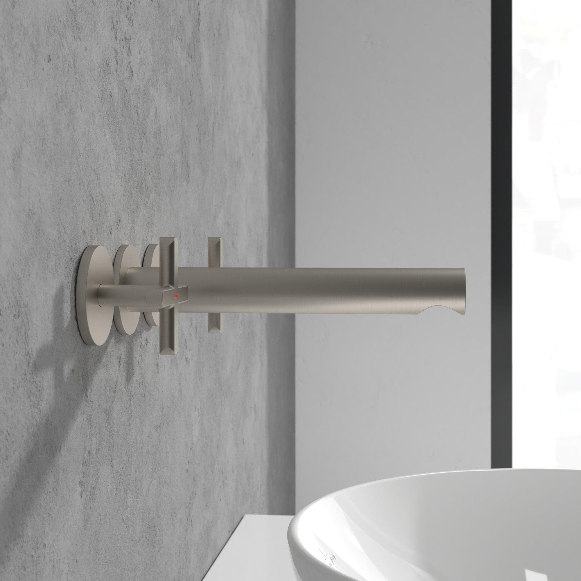 Vous recherchez un robinet à la fois au design épuré et confortable à utiliser, qui rehausse immédiatement l’apparence du mur de votre lavabo ? Dans ce cas, un robinet de lavabo trois trous pour montage mural est un excellent choix. Grâce à la combinaison d’un bec mince et de deux élégantes poignées en croix rotatives, il en résulte un ensemble symétrique qui s’intègre parfaitement dans les salles de bains modernes, mais aussi dans les intérieurs de style hôtel de luxe ou ambiance spa. La finition métallique mate et brossée ajoute une brillance subtile et haut de gamme sans être dominante. Ce robinet est particulièrement adapté si vous attachez de l’importance au design mais aussi au confort, à un jet d’eau doux et à une installation intelligente et peu encombrante au-dessus du lavabo. Idéal en combinaison avec une belle vasque à poser ou une large cuve de lavage, aussi bien dans la salle de bains principale que dans une élégante salle de bains destinée aux invités.