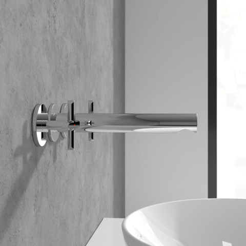 Avec ce robinet de lavabo trois trous, vous créez un ensemble dégagé et aéré autour du lavabo. Comme le bec et les poignées de commande sont intégrés dans le mur, votre plan de lavabo reste libre de larges bases de robinet et de rebords difficiles à nettoyer. Le bec droit avec un saillie d’environ 207 mm offre exactement la bonne distance par rapport au lavabo, de sorte que les éclaboussures sont limitées et que vous pouvez vous laver les mains confortablement. Les rosaces rondes assurent une finition soignée, donnant à l’ensemble un aspect épuré et réfléchi. Cela rend le robinet particulièrement adapté aux salles de bains design, aux guest bathrooms et aux toilettes de luxe où une apparence calme et haut de gamme est importante.