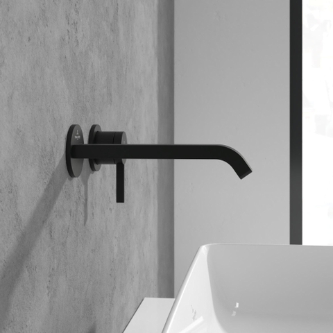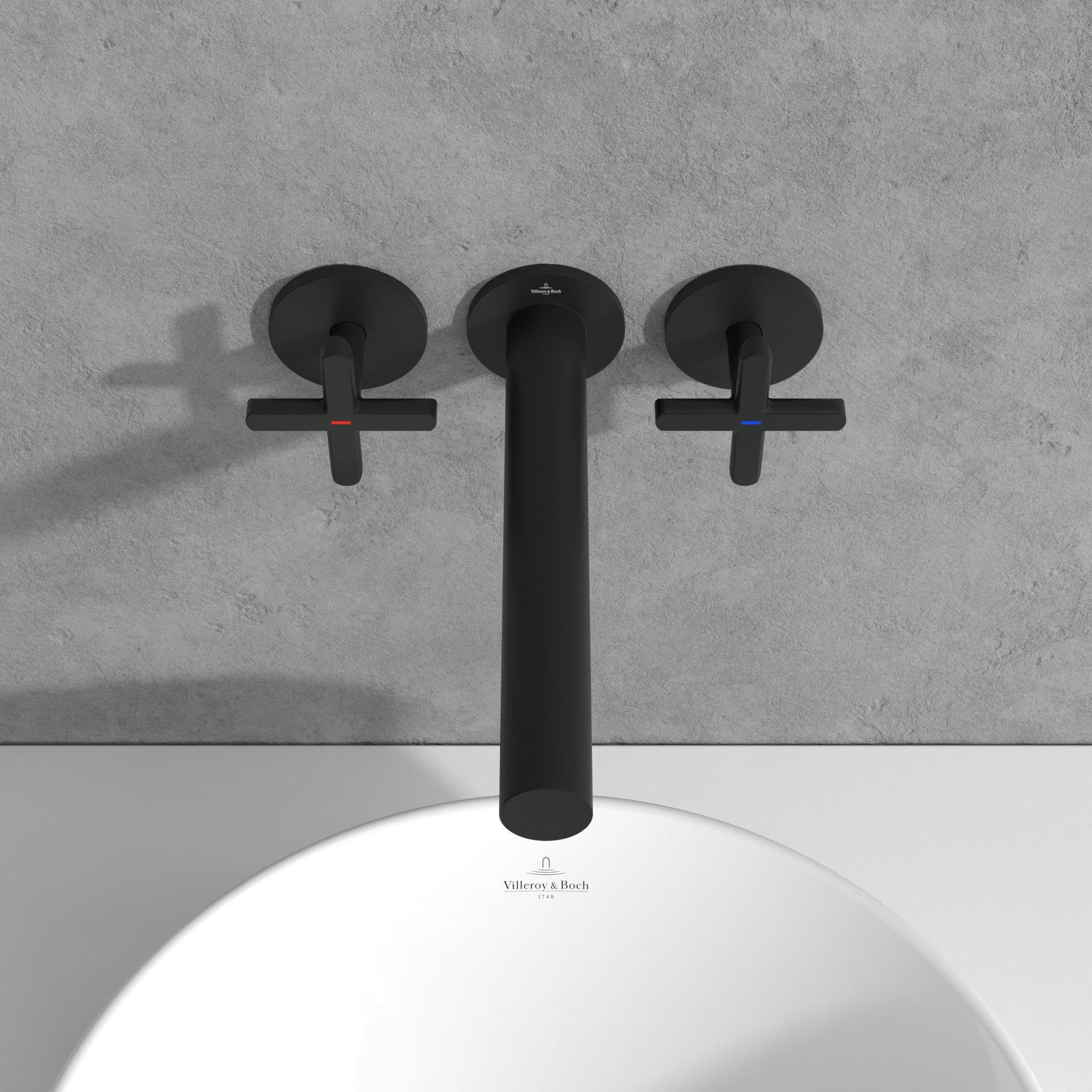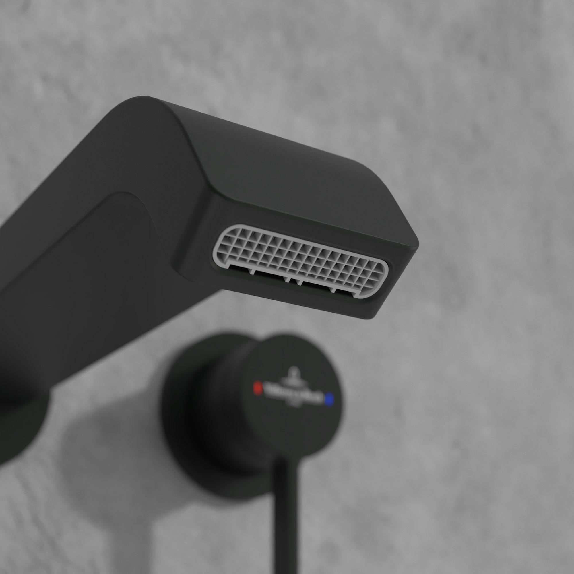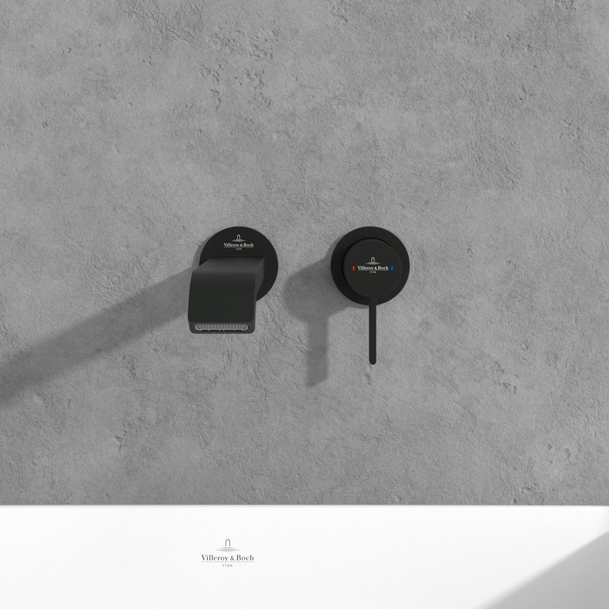 Avec son bec élancé, ses formes subtilement arrondies et sa couleur noir mat profonde, ce robinet s’intègre parfaitement dans les salles de bains modernes et industrielles. Le montage mural crée un jeu de lignes apaisant au-dessus du lavabo, mettant encore mieux en valeur le carrelage, la vasque et les accessoires. Le noir mat se marie à merveille avec la céramique blanche, la pierre naturelle et les tons bois, mais aussi avec le style béton et les carreaux foncés. Vous créez ainsi facilement une ambiance d’hôtel de luxe à la maison. Grâce à un design volontairement minimaliste, ce robinet reste intemporel et se combine aisément avec d’autres accessoires de salle de bains de même style.