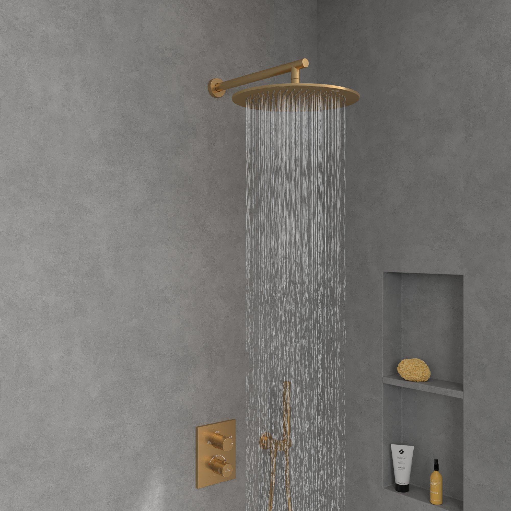 Vous recherchez une douche de pluie luxueuse qui donne immédiatement à votre salle de bains une ambiance haut de gamme digne d’un hôtel ? Cette généreuse pomme de tête de douche est idéale si vous aimez les longues douches relaxantes avec un jet plein et doux qui enveloppe tout votre corps. Grâce à son grand diamètre, ce modèle est parfait pour les douches à l’italienne spacieuses ou une cabine de douche confortable dans laquelle vous souhaitez faire de votre moment de douche un véritable rituel bien-être quotidien. La forme ronde et la finition soignée en métal brossé couleur or s’intègrent parfaitement dans les salles de bains modernes et design, mais se combinent également de manière surprenante avec des styles intemporels et épurés. Si vous optez consciemment pour la qualité, le confort et un élément de décoration élégant dans votre douche, il s’agit alors d’un investissement judicieux dont vous profiterez pendant de longues années.