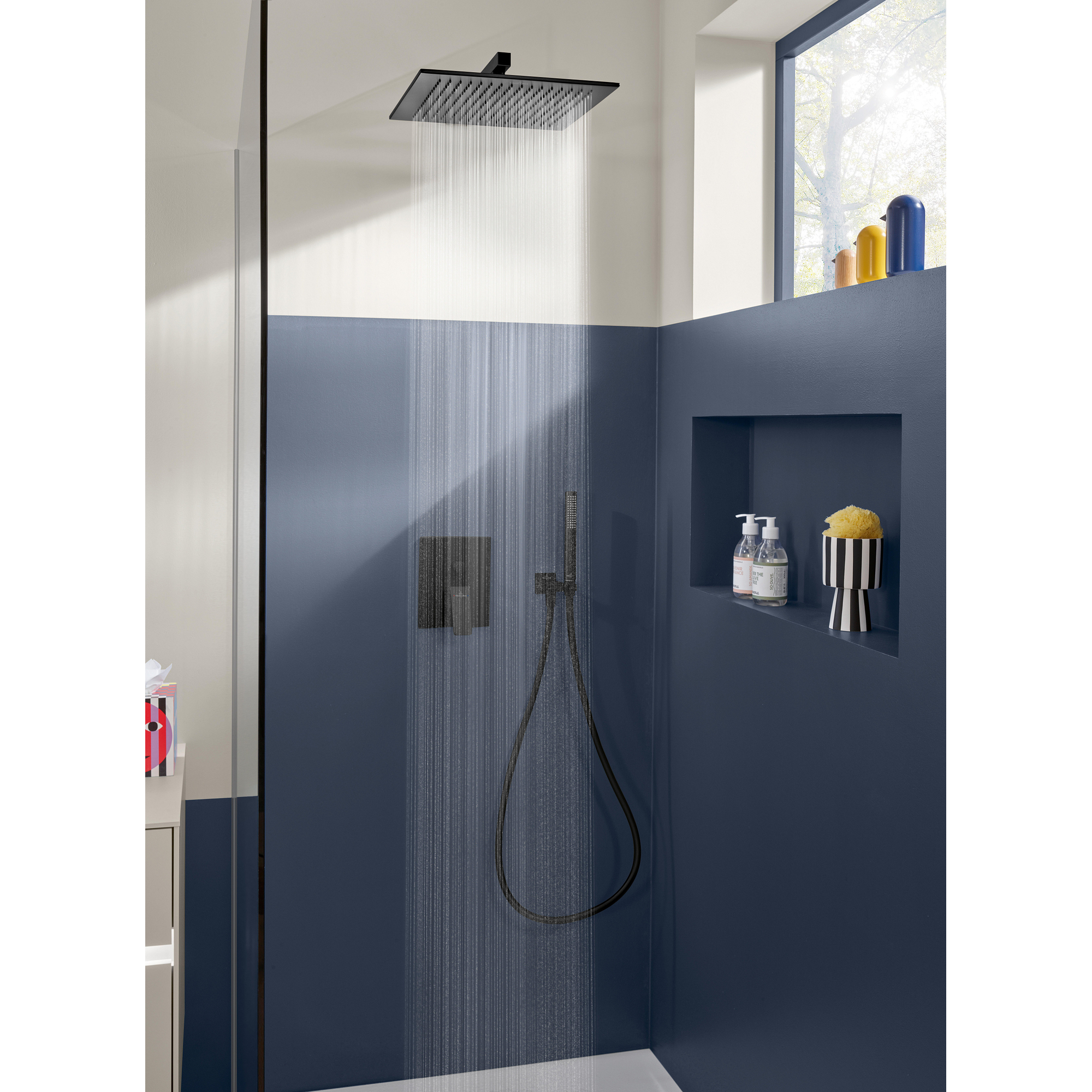 - Finition noire mate pour une apparence luxueuse et contemporaine dans l’espace de douche.