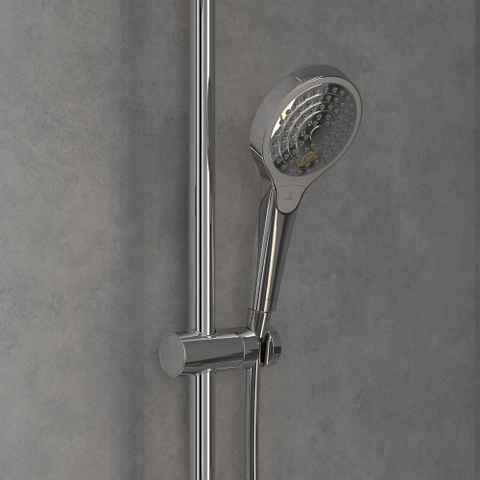 Convivial et sûr Grâce au mitigeur thermostatique intégré, vous profitez d’une température constante pendant la douche. De plus, la limitation de température optionnelle offre une sécurité supplémentaire, ce qui est idéal pour les familles. Le passage entre la douchette à main et la douche de tête est simple grâce au bouton inverseur.