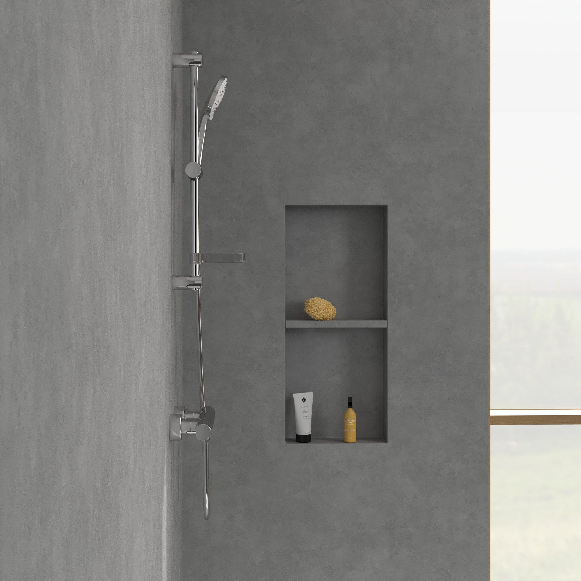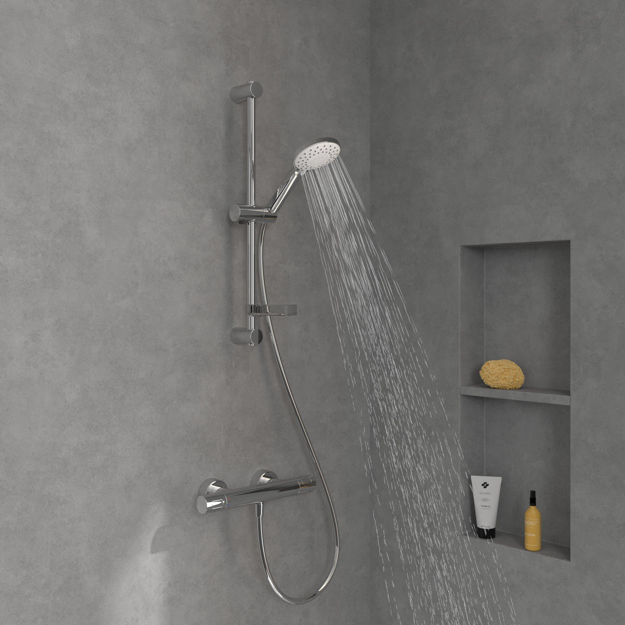 L’ensemble barre de douche est conçu pour un usage quotidien pratique. Le support de douchette est réglable en hauteur de façon continue, ce qui permet à chacun à la maison de régler facilement sa hauteur de douche idéale. Pratique si votre famille compte des personnes de tailles différentes ou si vous souhaitez parfois vous doucher en position assise. De plus, vous pouvez incliner la pomme de douche, de sorte que le jet d’eau tombe exactement dans la direction souhaitée cela évite les éclaboussures et assure une répartition confortable de l’eau. Le flexible de douche généreux offre suffisamment de liberté de mouvement, par exemple pour rincer les enfants ou pour rincer facilement la cabine de douche après utilisation. Grâce à sa conception bien étudiée, la douchette tient agréablement en main et l’ensemble donne une impression de solidité et de fiabilité.