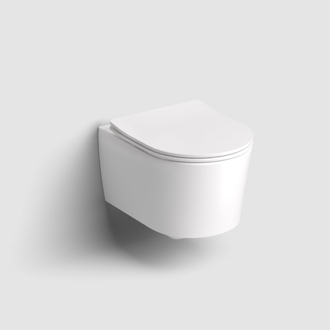 - WC suspendu compact avec faible profondeur d’environ 48 cm, idéal pour les petites salles de bains et les espaces toilettes.