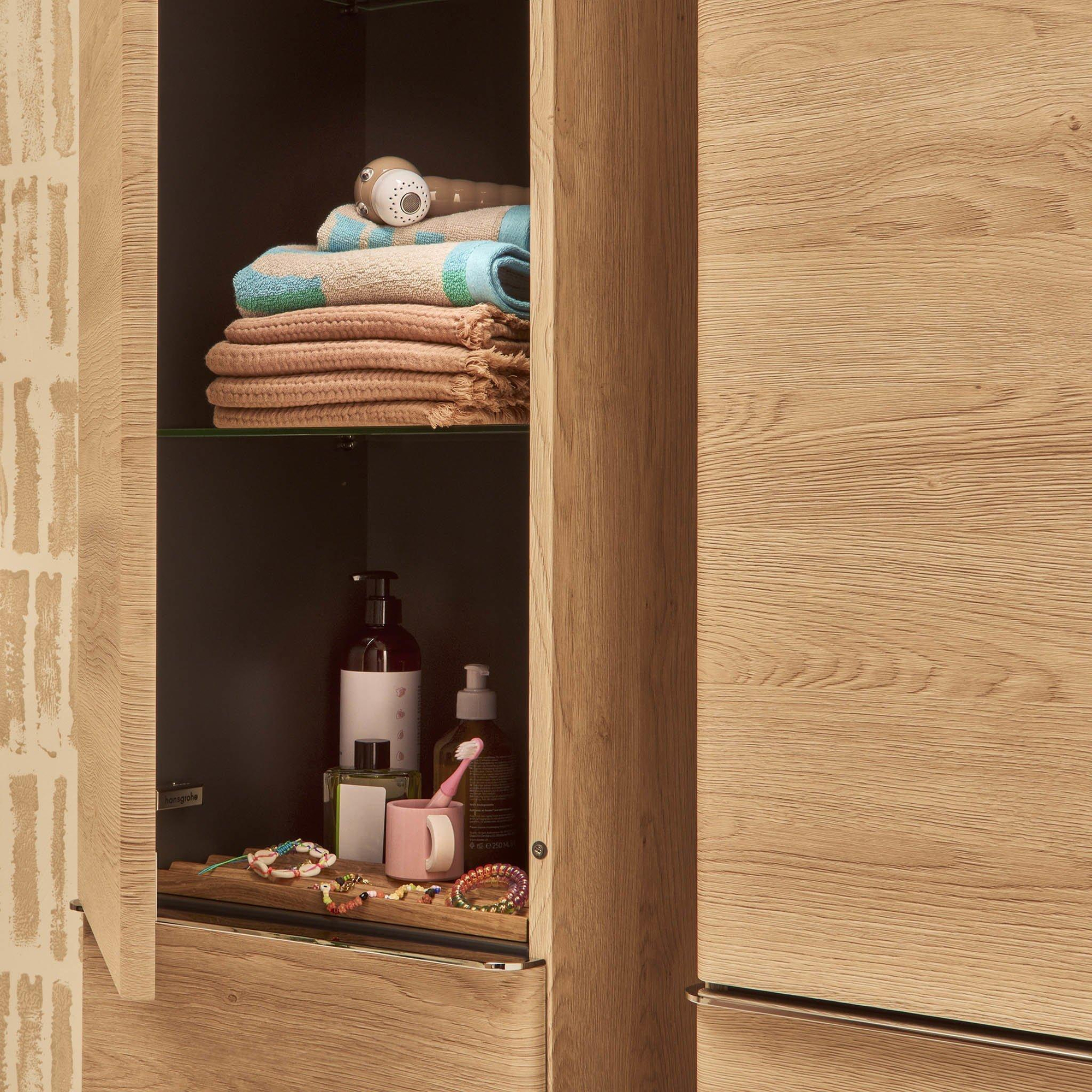 Un design de salle de bains chaleureux avec la Hansgrohe Xelu armoire haute 165x40x35cm charnière gauche chêne naturel