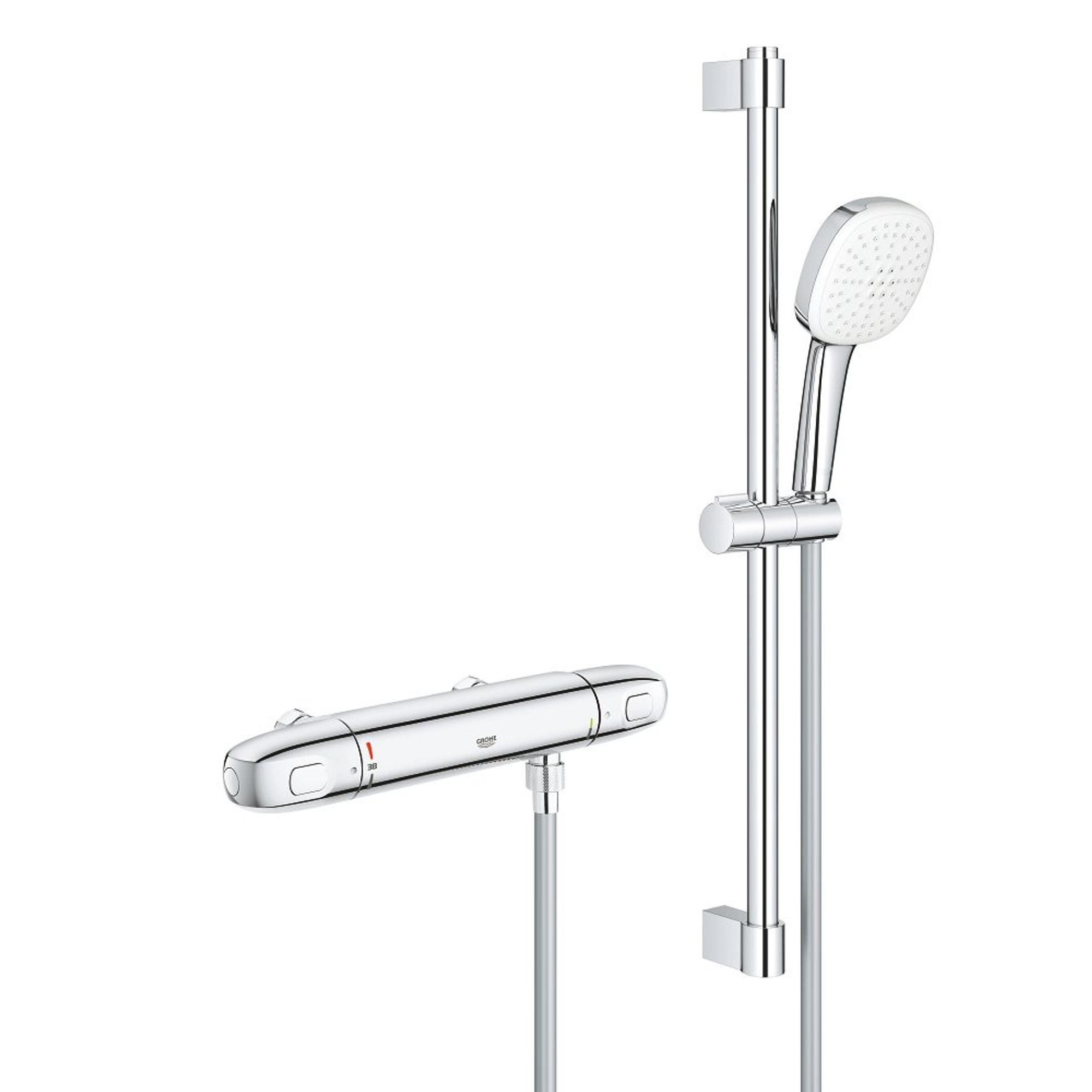 GROHE Grohtherm 1000 Ensemble de douche - mitigeur de douche thermostatique - entraxe=12cm - avec ensemble barre de douche - 60cm - douchette à main carrée - 2 jets - flexible de douche lisse - chrome