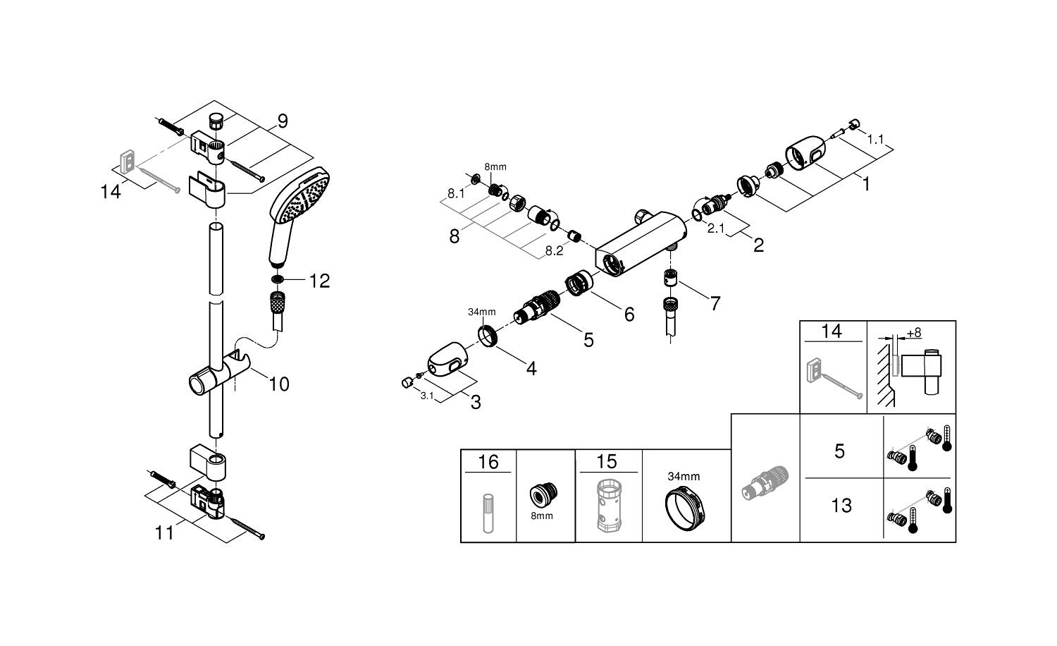 GROHE Grohtherm 1000 Ensemble de douche - robinet de douche thermostatique - HOH=12cm - avec ensemble de douche - 60cm - pomme de douche carrée - 2 types de jets - flexible de douche lisse - chrome