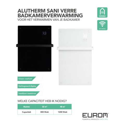 Eurom Alutherm Radiateur convecteur - 81.5x43.8cm - IP24 - 1200watt - wifi - sol/mur - Vertical - métal/verre noir mat