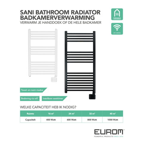 Eurom Sani-Towel radiateur sèche-serviettes électrique - 130x50cm - 1000 watts - WiFi - noir mat