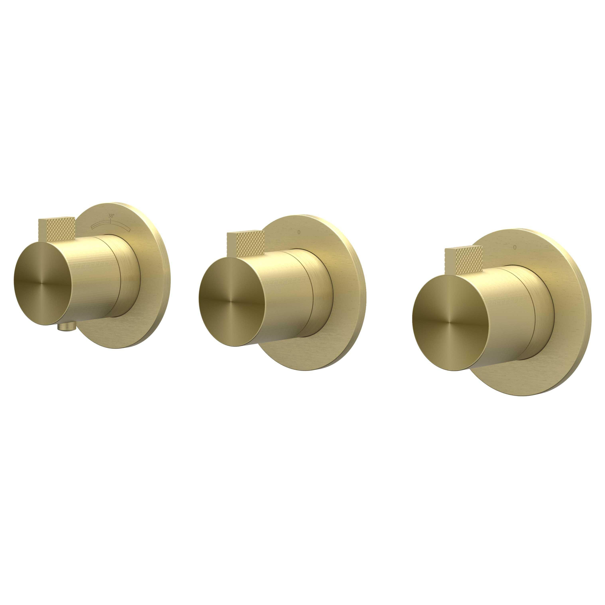 IVY Tribe Partie externe mitigeur thermostatique encastré avec 3 robinets d'arrêt Symmetry avec rosaces rondes en acier inoxydable 316 or mat brossé PVD