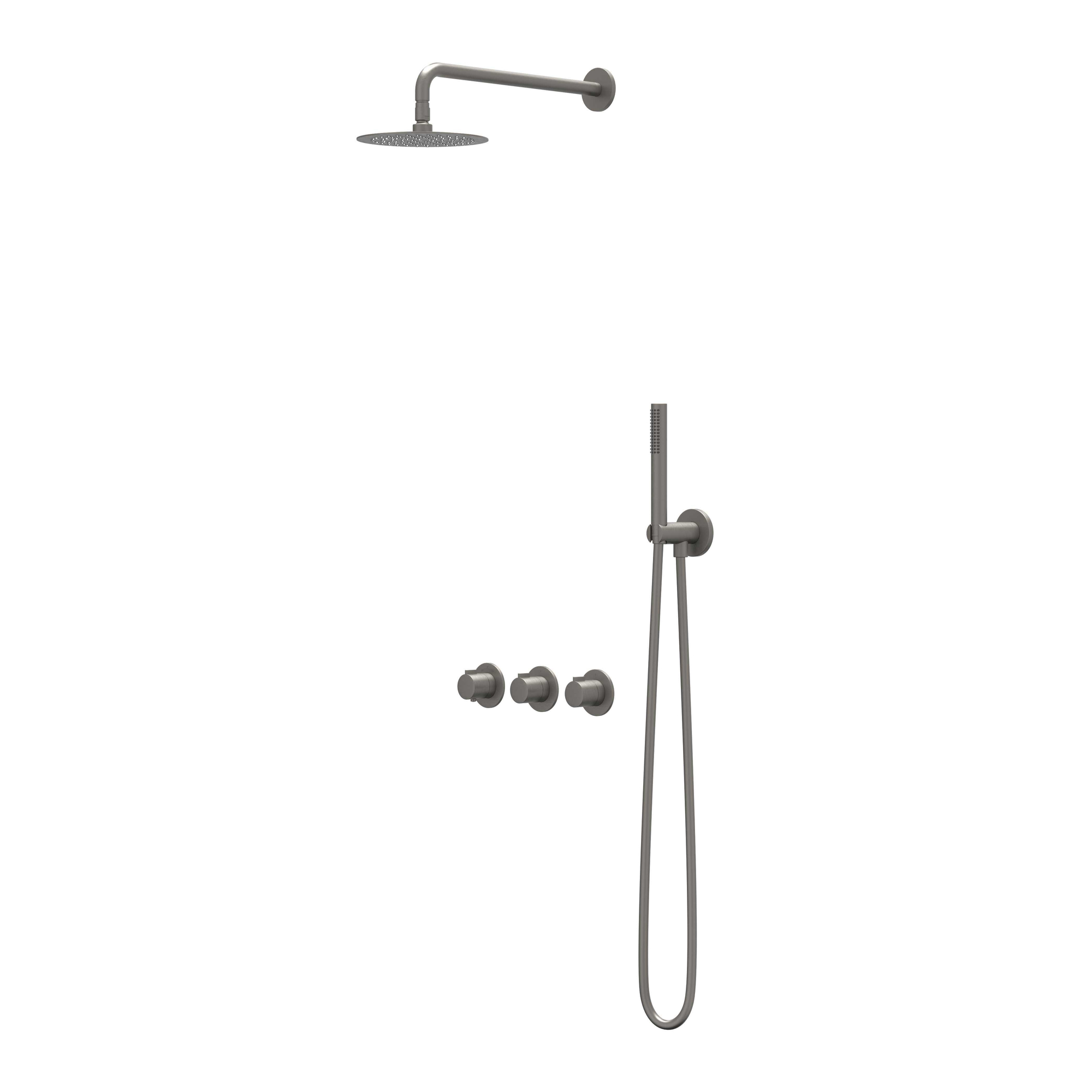 IVY Pact Ensemble de douche à effet pluie - encastré - symmetry - 2 robinets d'arrêt - bras mural 40 cm - pomme de douche slim 30 cm - barre de douche avec sortie - flexible de douche 150 cm - douchette 3 jets - Noir métal brossé PVD