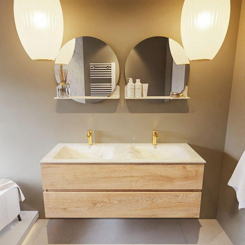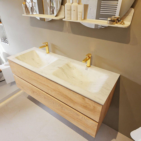 MONDIAZ VICA-DLUX Ensemble meuble de salle de bains - 130cm - meuble sous-vasque chêne blanchi - 2 tiroirs - lavabo encastré cloud double - 2 trous de robinet - version haute 60cm - opalo