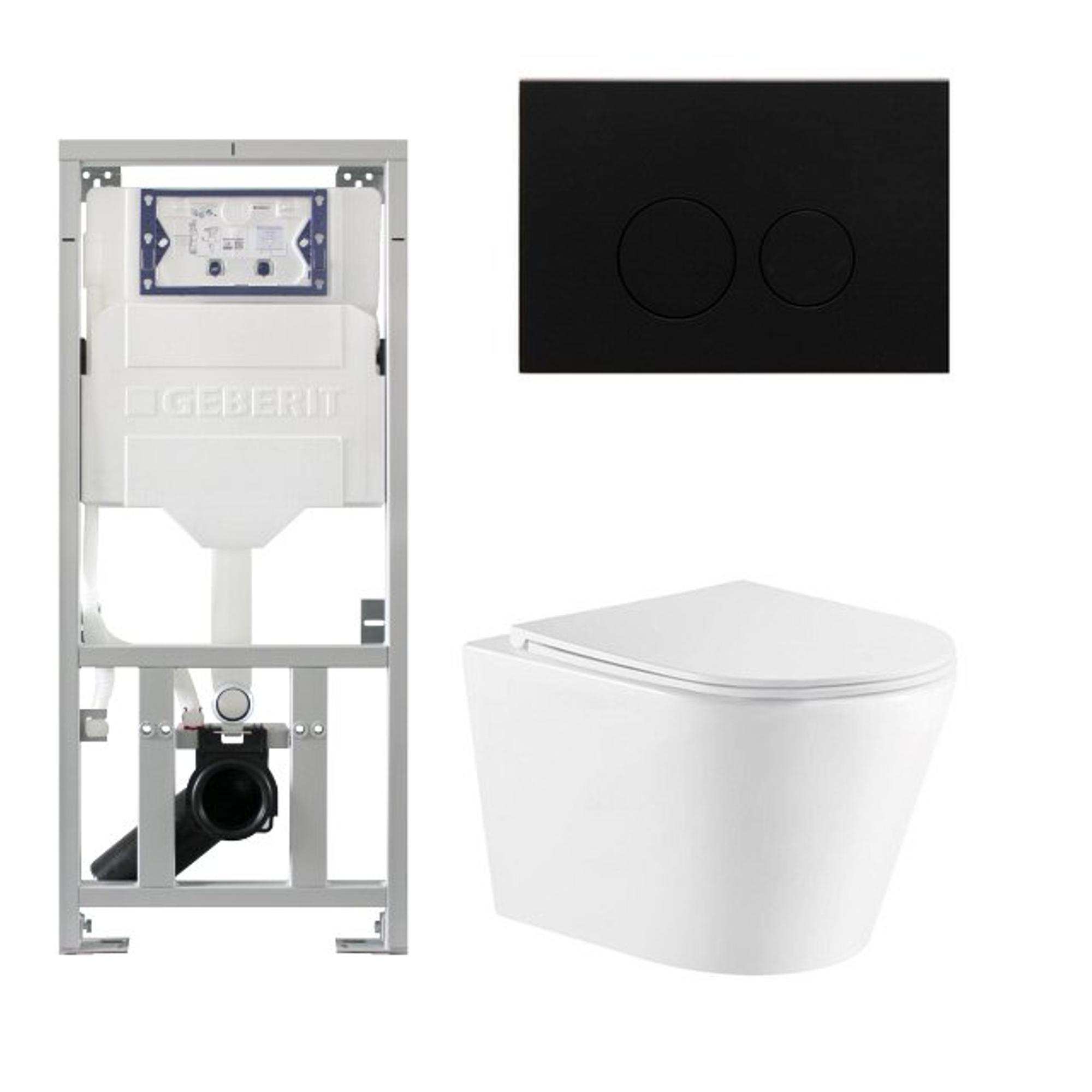 Pack WC QeramiQ Dely - 36.3x51.7cm - à fond creux - sans bride - réservoir encastré Geberit UP320 - abattant WC à fermeture douce - plaque de commande noire mate - boutons ronds - blanc brillant