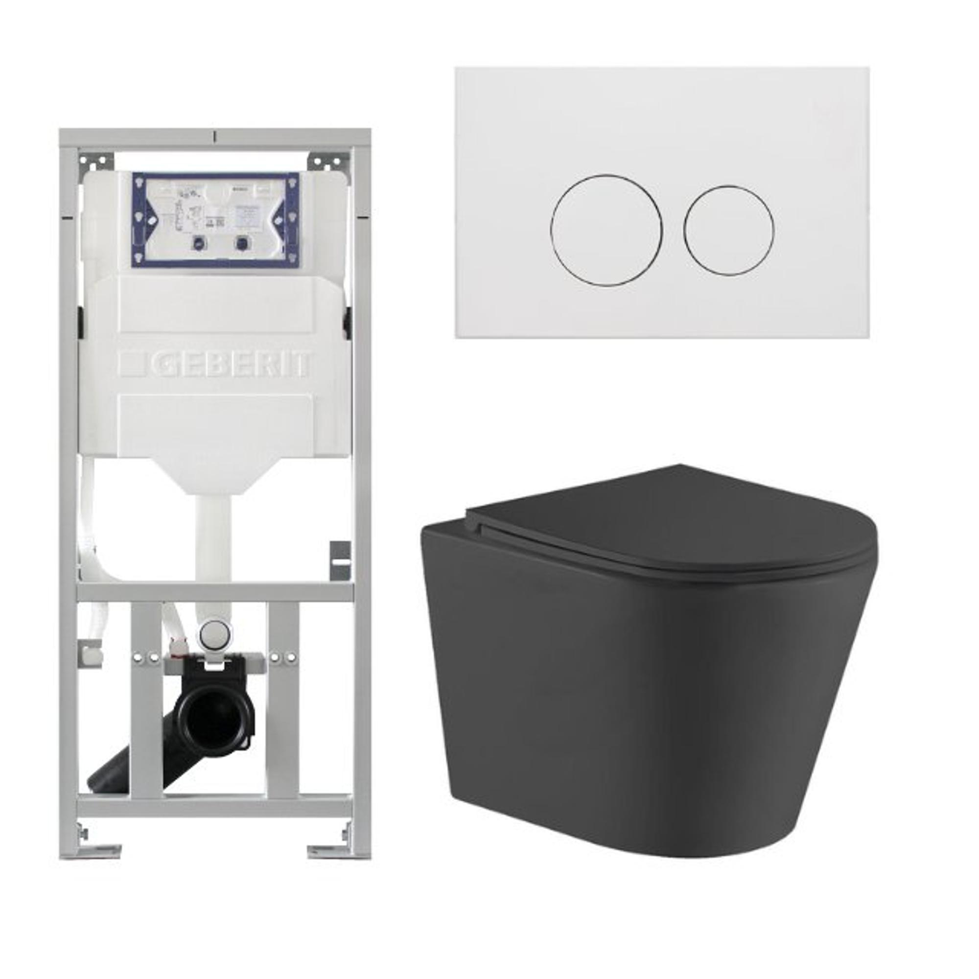 QeramiQ Dely Ensemble WC - 36.3x51.7cm - sortie profonde - sans bride - réservoir encastré Geberit UP320 - avec cadre Burda - abattant de WC softclose - plaque de commande blanc mat - boutons ronds - noir mat