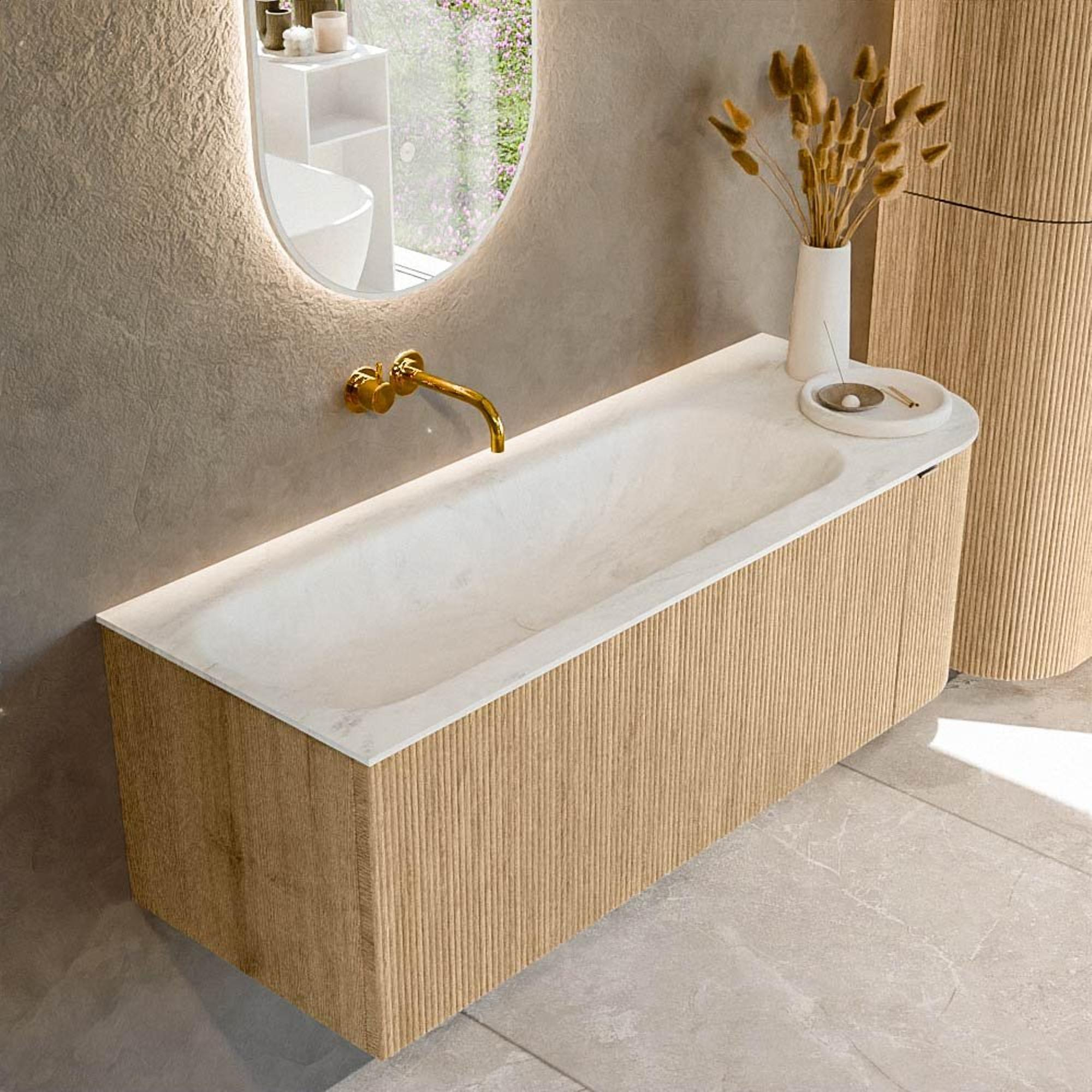 MONDIAZ KURVE-DLUX 125cm Meuble salle de bain avec module 25 D - couleur Oak - 1 tiroir - 1 porte - vasque BIG MEDIUM gauche - sans trou de robinet - couleur Opalo