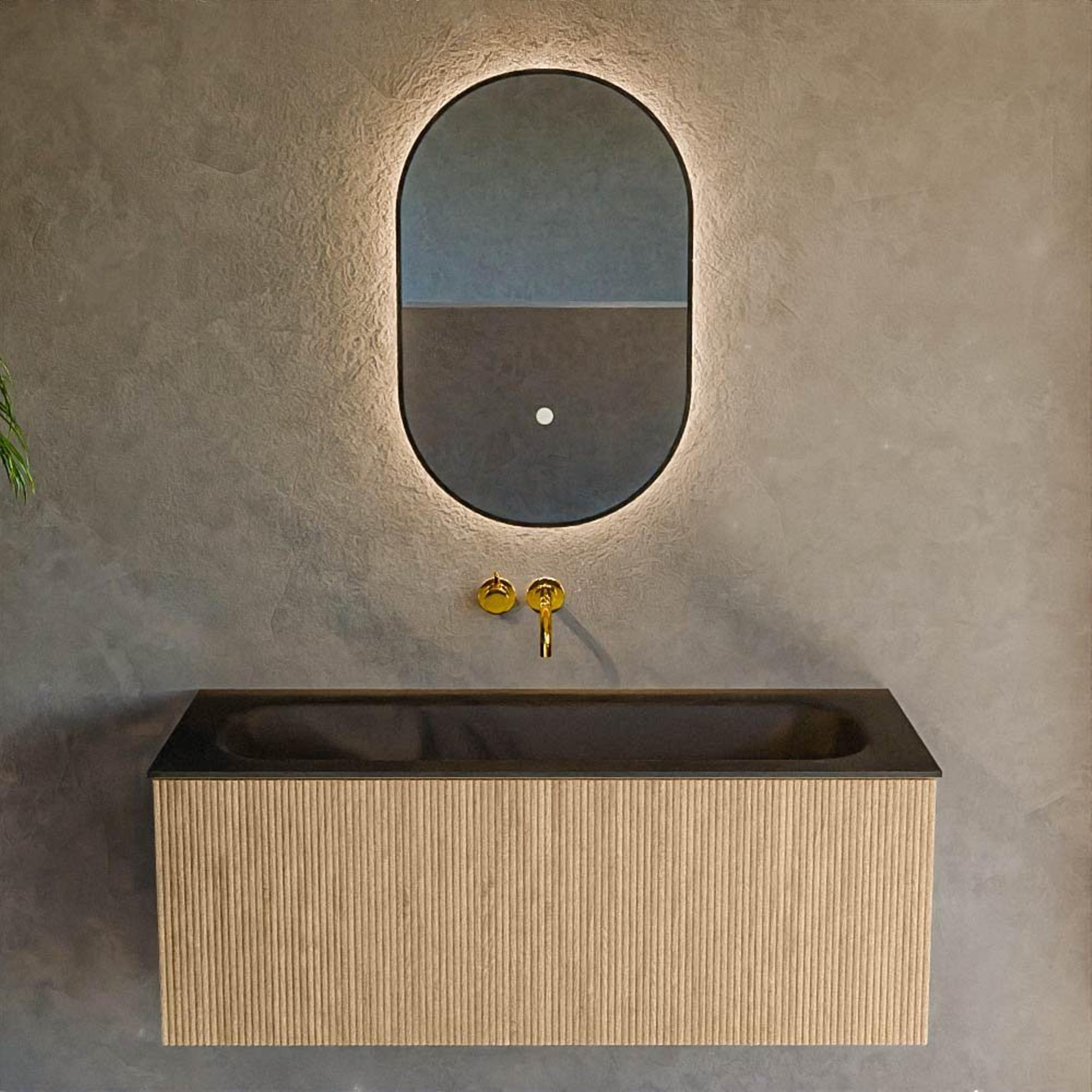MONDIAZ KURVE 110cm Meuble salle de bain - couleur Oak - 1 tiroir - vasque BIG MEDIUM centre - sans trous de robinet - Urban