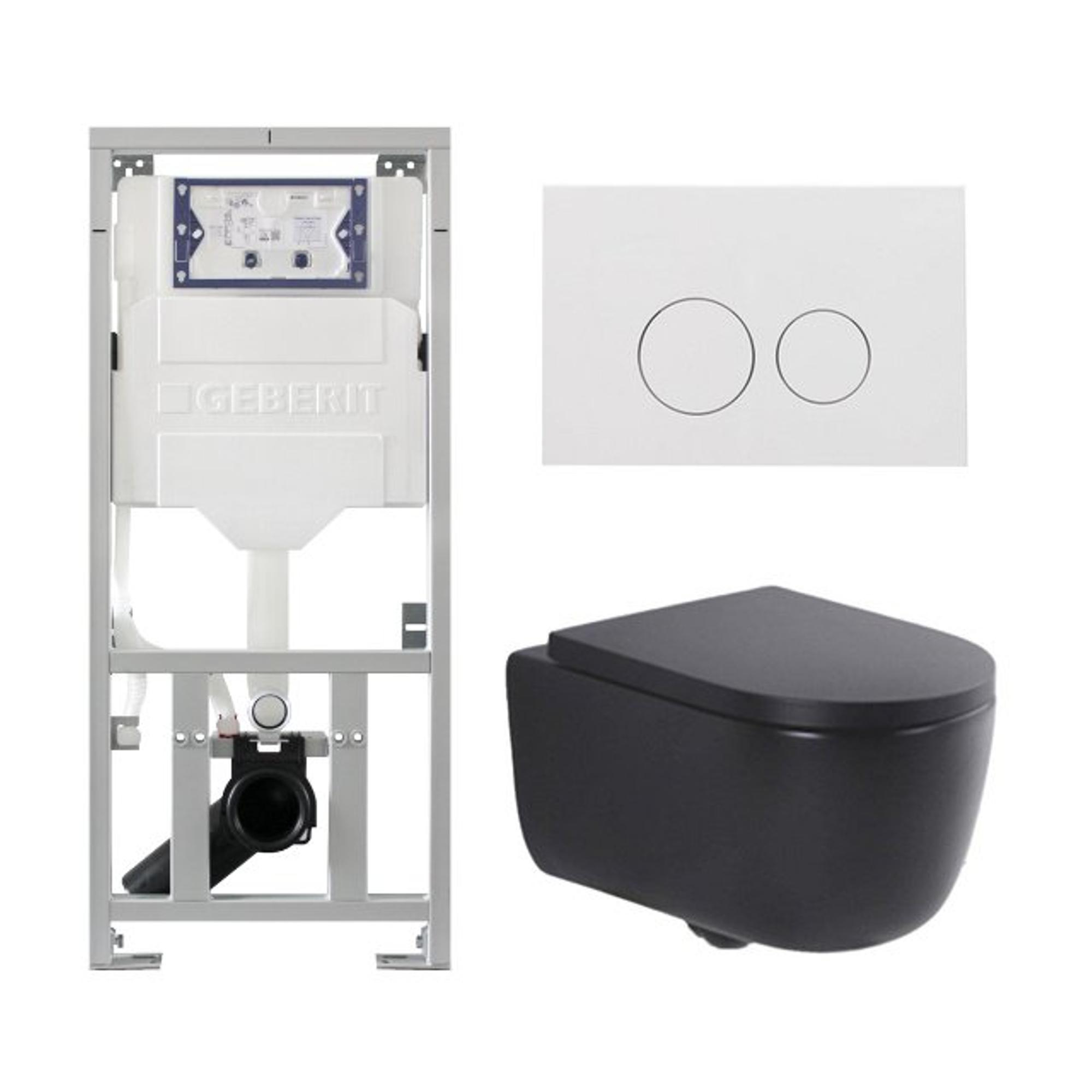 QeramiQ Ensemble de toilette Dely avec toilette sans rebord à fond creux 36.3x51.7 avec réservoir de chasse encastré Geberit UP320 siège à fermeture douce blanc brillant et plaque de commande blanche brillante avec boutons ronds ABS