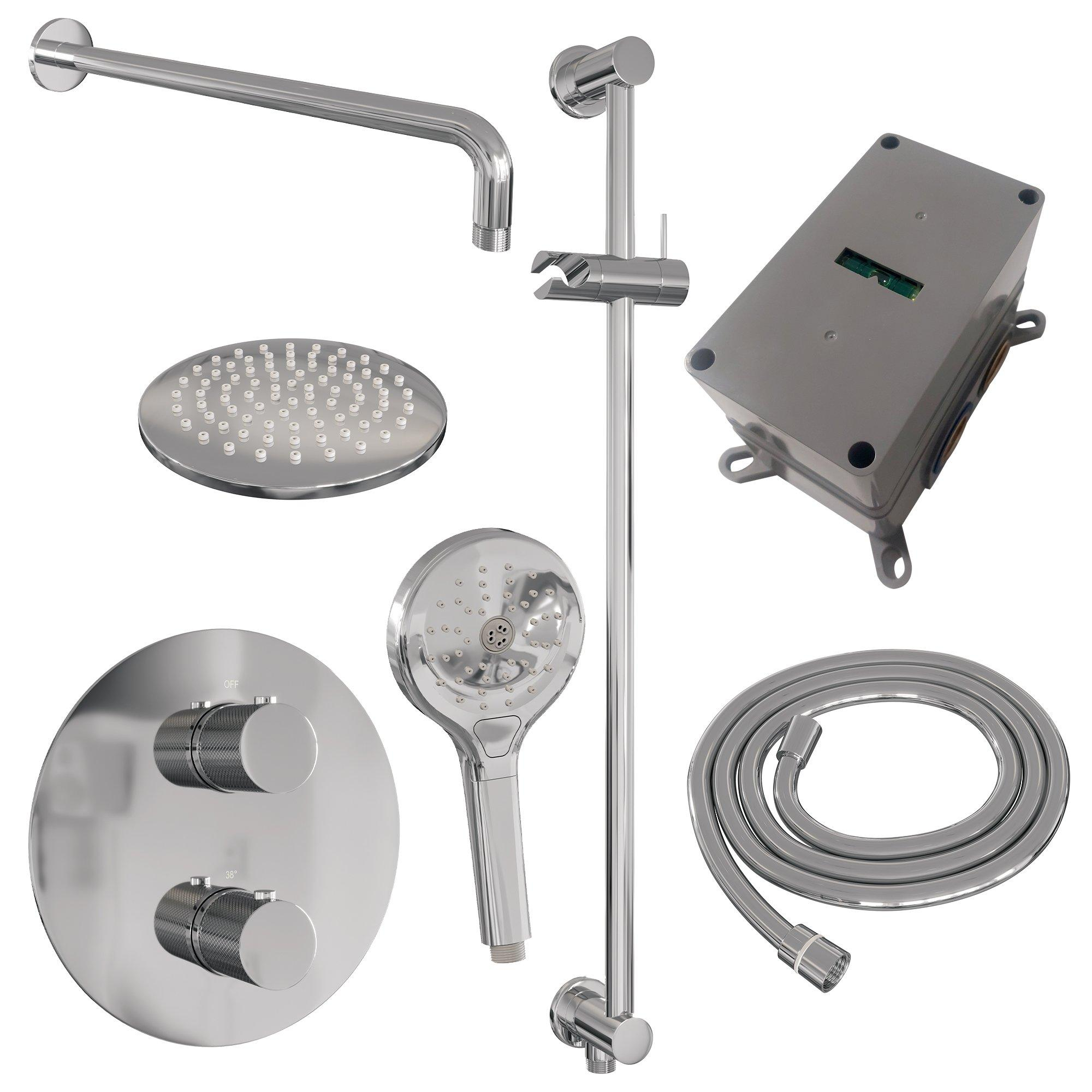 BRAUER Chrome Carving douche thermostatique encastrée - 3 voies - rond - set 93 - douche principale de 20 cm - bras mural courbé - douchette à main 3 positions - flexible de douche - barre de douche intégrée - chrome