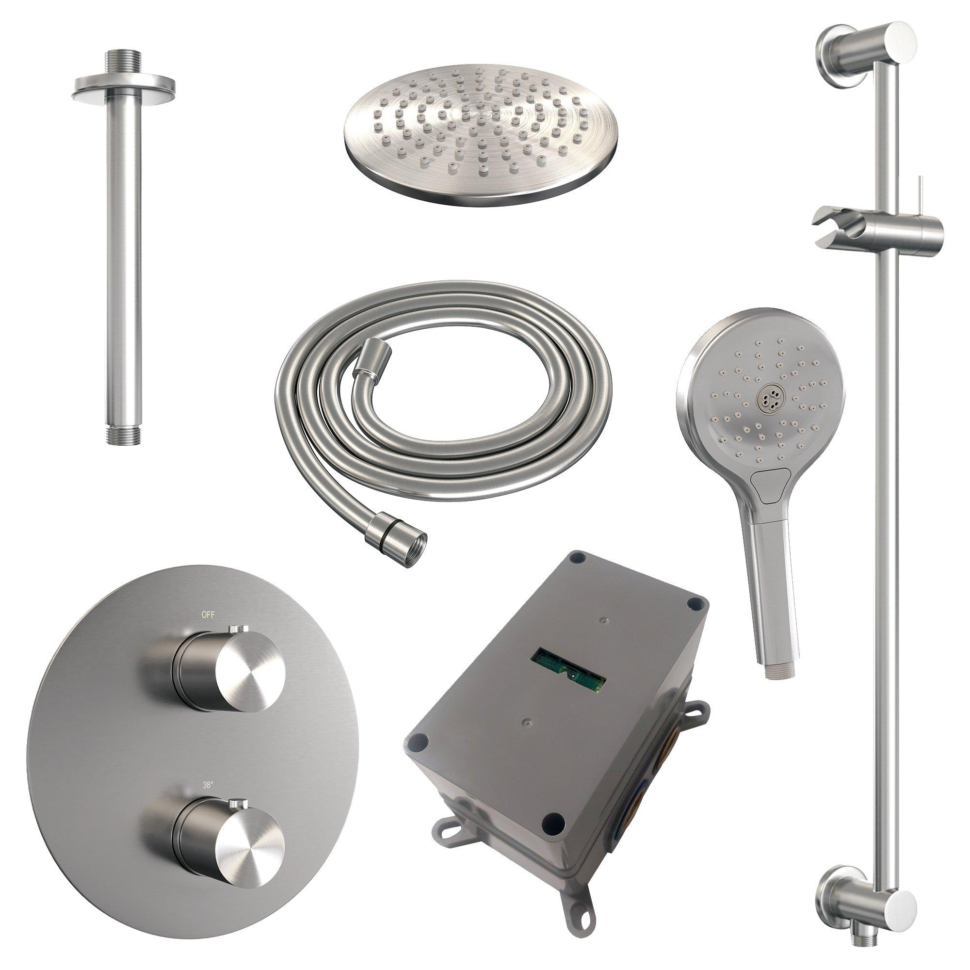 BRAUER Édition Brossée douche de pluie thermostatique encastrée - 3 voies - rond - set 95 - douche principale 20cm - bras plafond - douchette 3 positions - flexible de douche - colonne de douche intégrée - inox brossé PVD