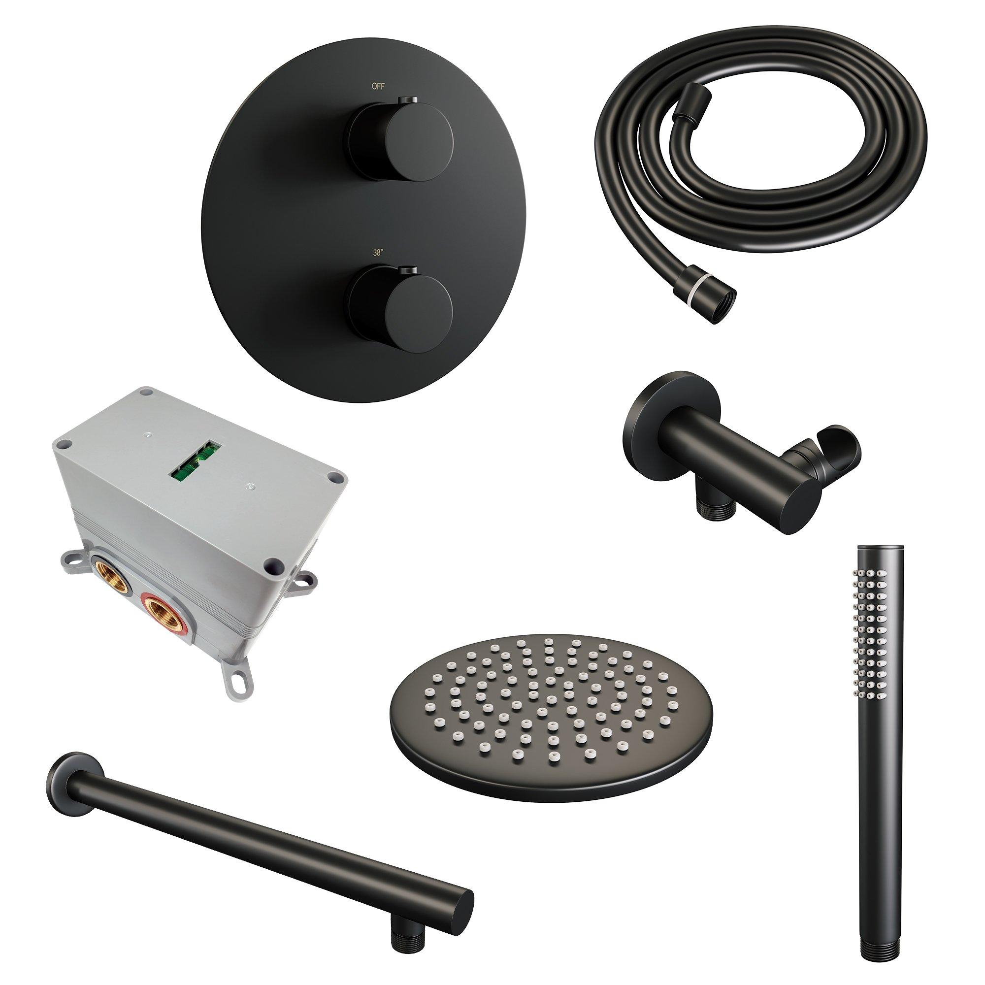 BRAUER Black Edition douche thermostatique encastrée - 3 voies - rond - set 73 - douche principale de 20 cm - bras mural droit - douchette à main - flexible de douche - coude mural - noir mat