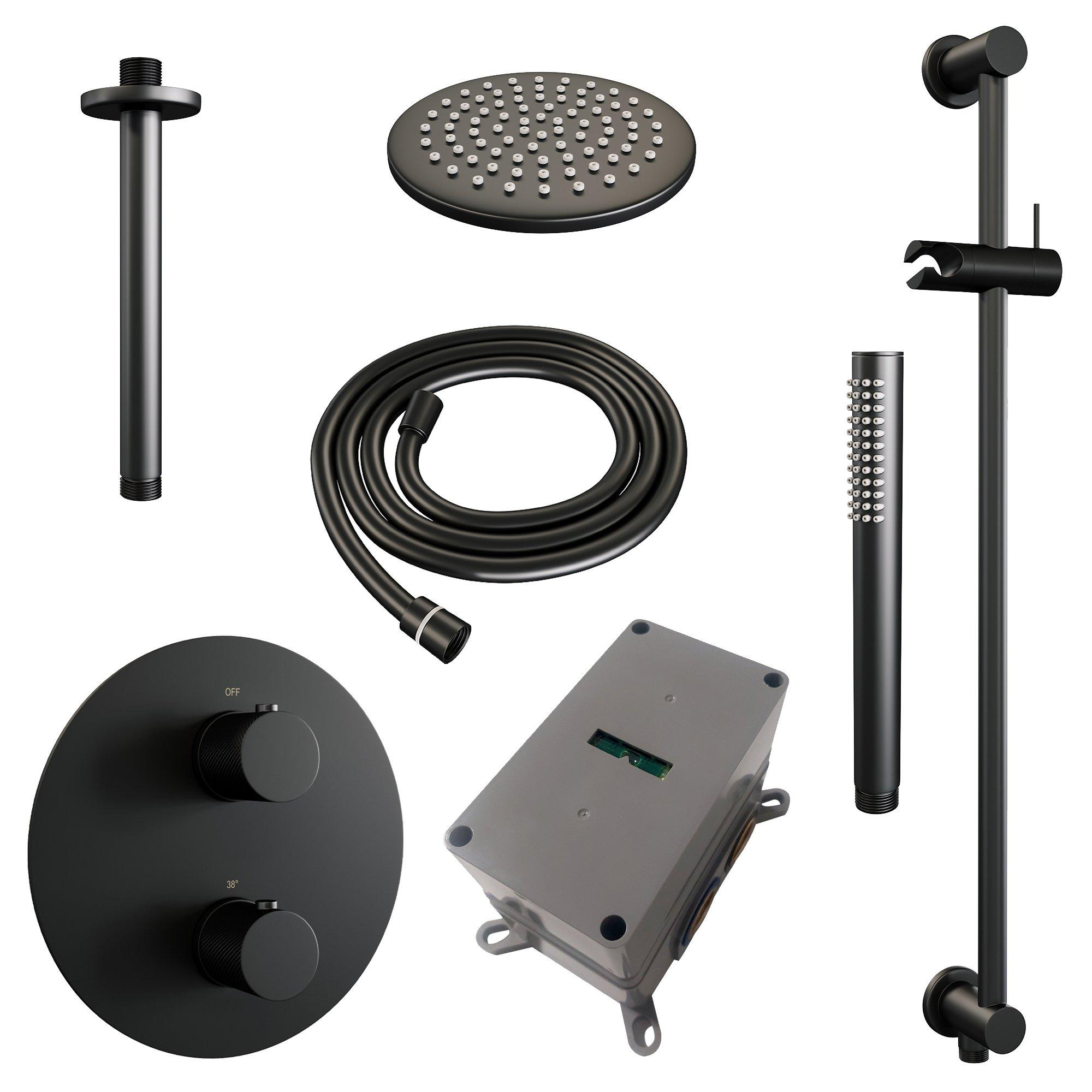 BRAUER Black Carving douche thermostatique encastrée - 3 voies - rond - set 89 - 20cm douche principale - bras plafond - douchette à main - flexible de douche - colonne de douche hydromassante intégrée - noir mat