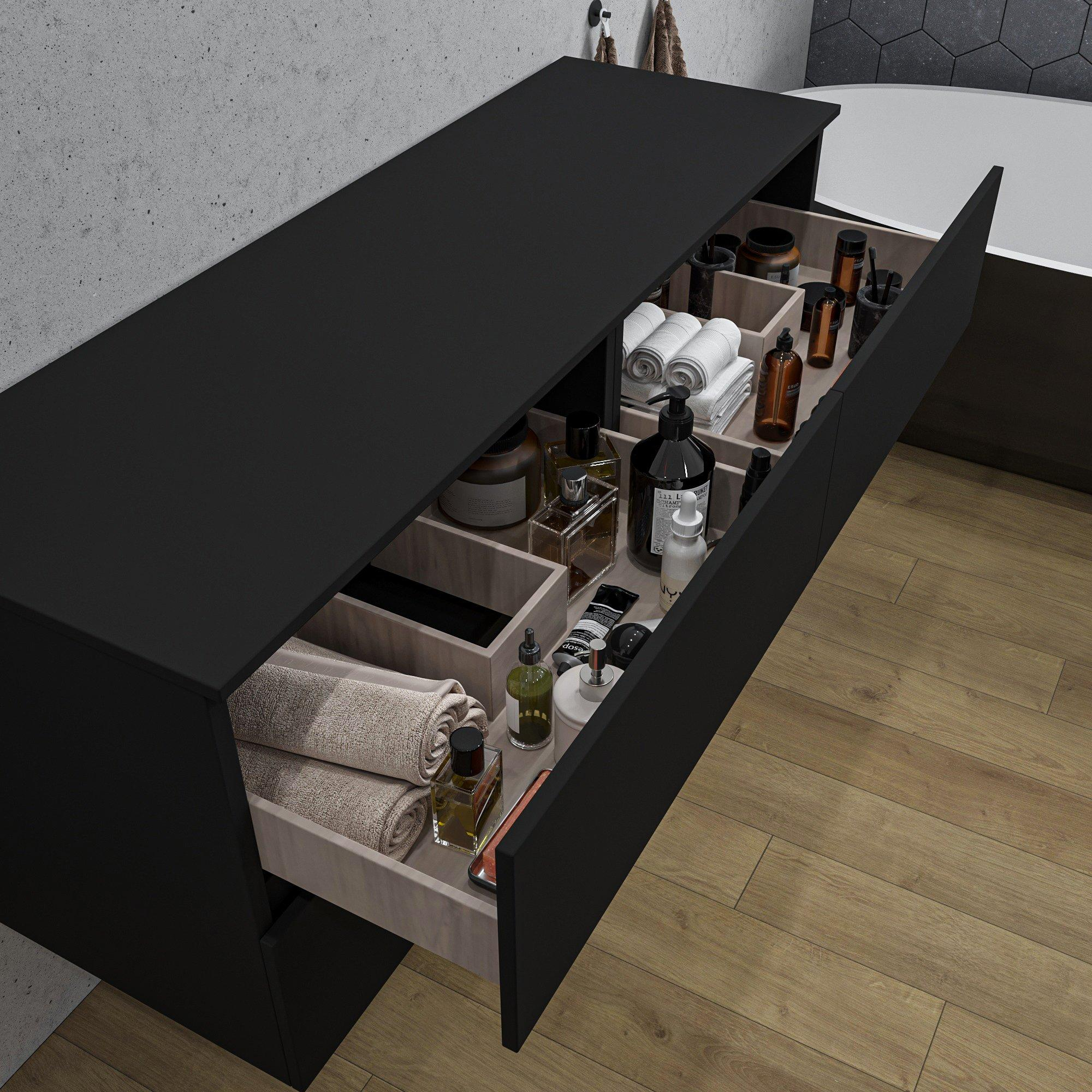 Élégant Le meuble bas de salle de bains Saniclass Chaci est conçu avec soin pour ajouter une touche d'élégance à l'intérieur de ta salle de bains. La finition noire mate apporte une touche moderne et s'accorde parfaitement avec différents styles de salle de bains. Les tiroirs sans poignées assurent une apparence épurée et minimaliste, tandis que les quatre tiroirs spacieux offrent suffisamment d'espace de rangement pour toutes tes affaires de salle de bains. Avec ce meuble bas, tu fais entrer chez toi non seulement un meuble fonctionnel, mais aussi un élément accrocheur qui te fera sourire chaque jour.
