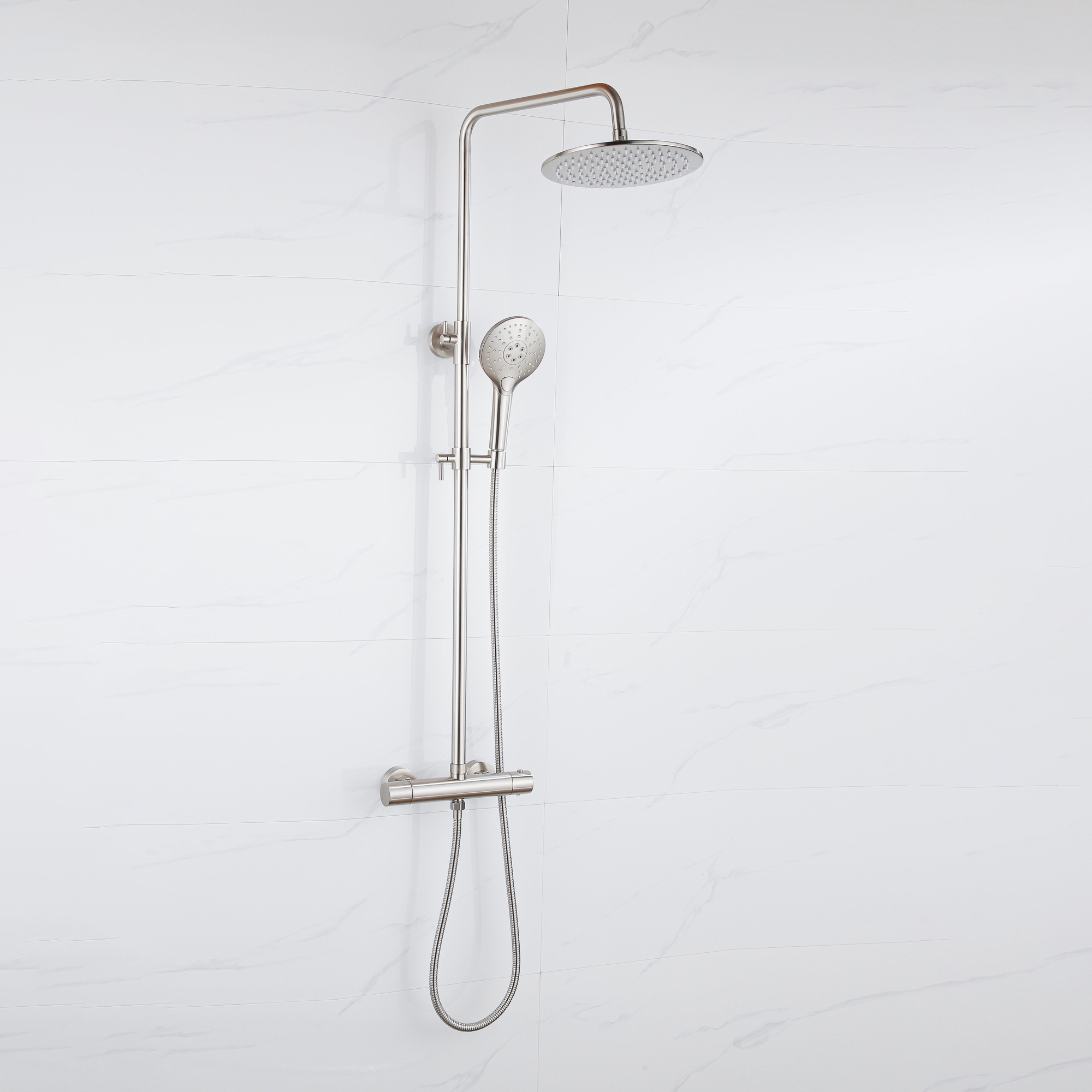 Fortifura Calvi Ensemble de douche de pluie thermostatique - pomme de douche 25cm - flexible métallique - douchette ronde - inox brossé PVD