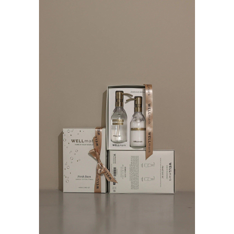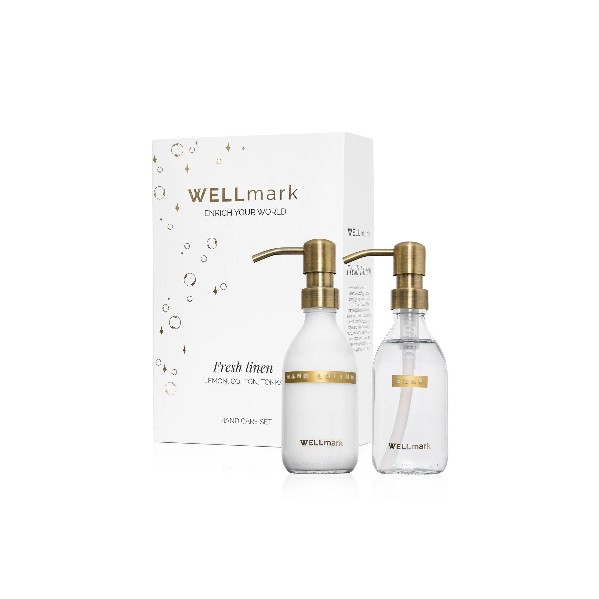 Wellmark Coffret soin des mains - coffret cadeau - crème pour les mains 250 ml - savon pour les mains 250 ml - fresh linnen - verre transparent - texte : bubbles of joy