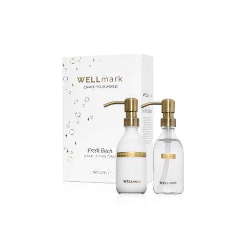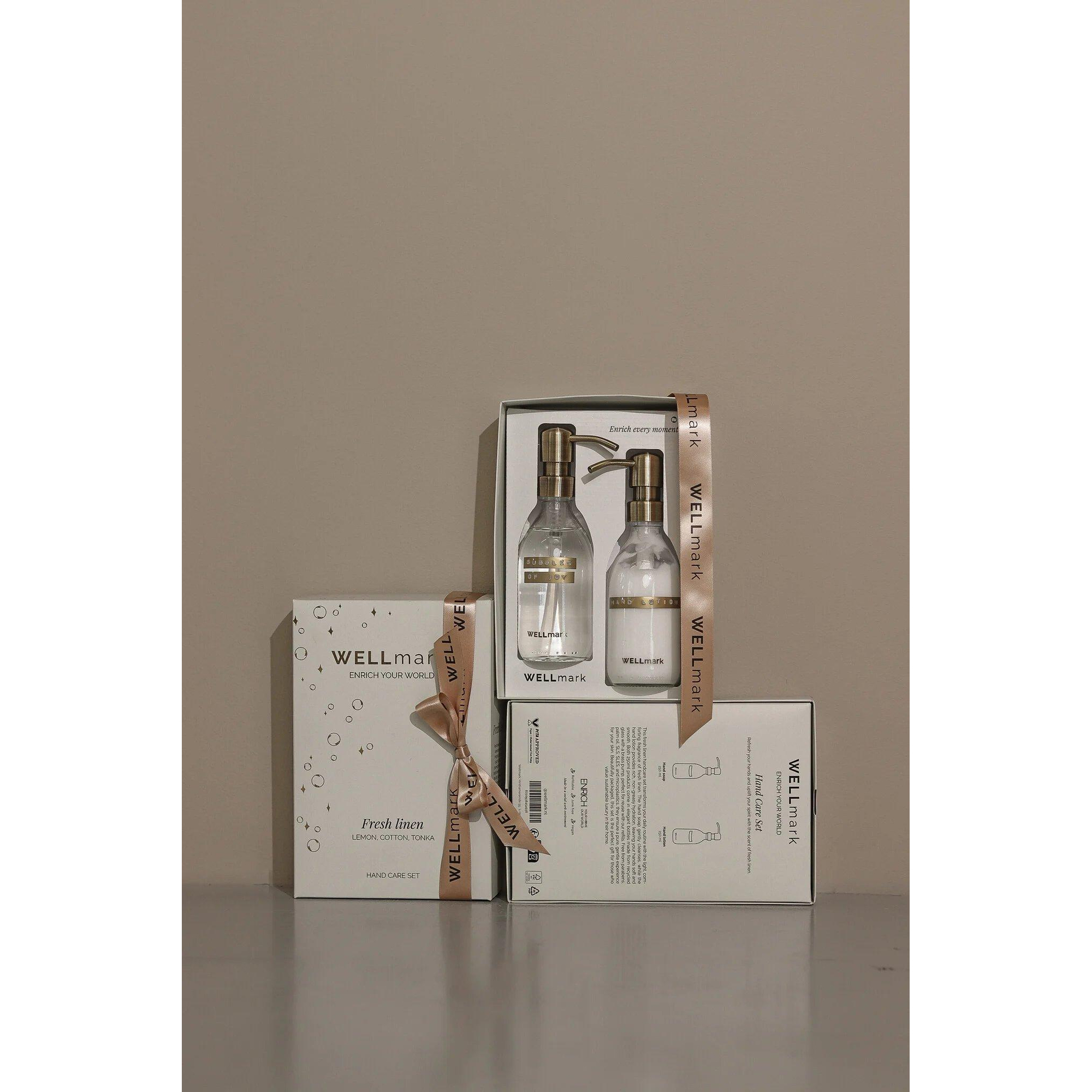Wellmark Set de soins des mains - coffret cadeau - crème pour les mains 250ml - savon pour les mains 250ml - linge frais - verre clair - texte : bubbles of joy
