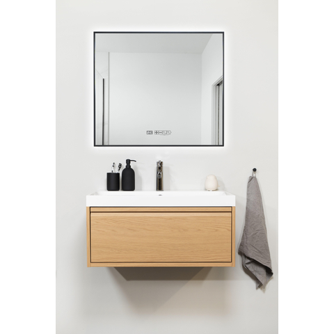 La combinaison d'un miroir rectangulaire et épuré et d'un panneau arrière noir mat confère à ce panneau une apparence moderne et luxueuse. La dimension de 80x70 cm est suffisamment généreuse pour vous permettre de vous regarder confortablement dans le miroir, tout en gardant un ensemble visuellement discret sur le mur. La couleur noire mate s'accorde parfaitement avec les tendances actuelles telles que les salles de bains industrielles, les robinets noirs et les intérieurs minimalistes. Comme il s'agit d'un modèle mural, vous conservez votre surface au sol libre et votre salle de bains reste spacieuse. L'éclairage LED subtil tout autour crée une lueur chaleureuse le long des bords du miroir et donne immédiatement à votre salle de bains une allure d'hôtel haut de gamme.