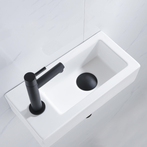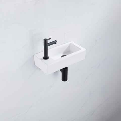 QeramiQ Lave-mains Kit lave-mains - 37.5x18.5x9cm - céramique - trou de robinet gauche - robinet lave-mains noir mat - bonde de vidage - siphon abaissé - Mat blanc