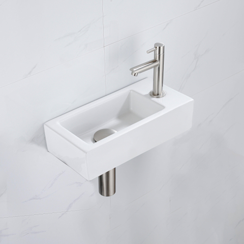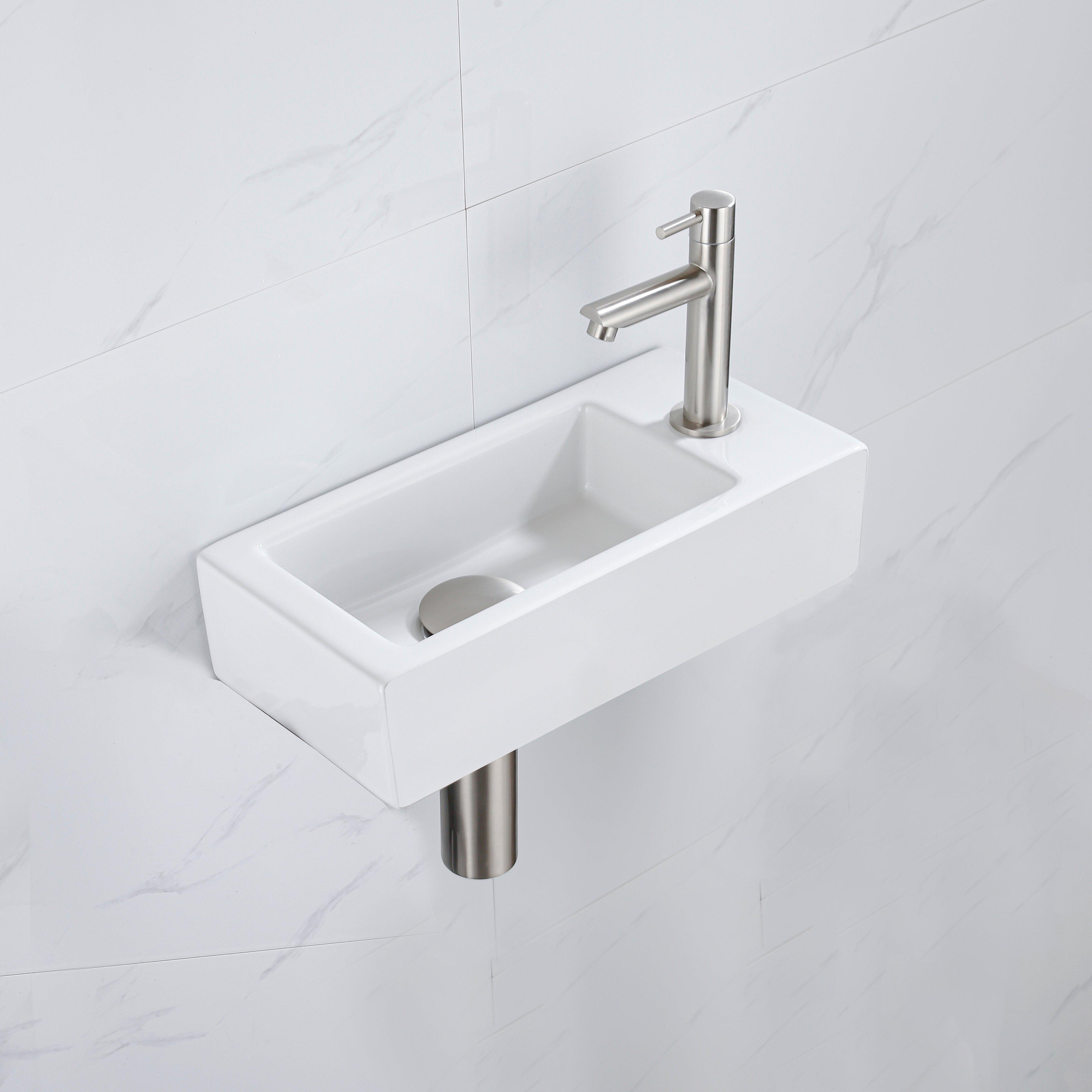QeramiQ Lave-mains Kit lave-mains - 37.5x18.5x9cm - céramique - trou de robinet à droite - robinet lave-mains en inox brossé - bonde de vidage - siphon abaissé - Mat blanc