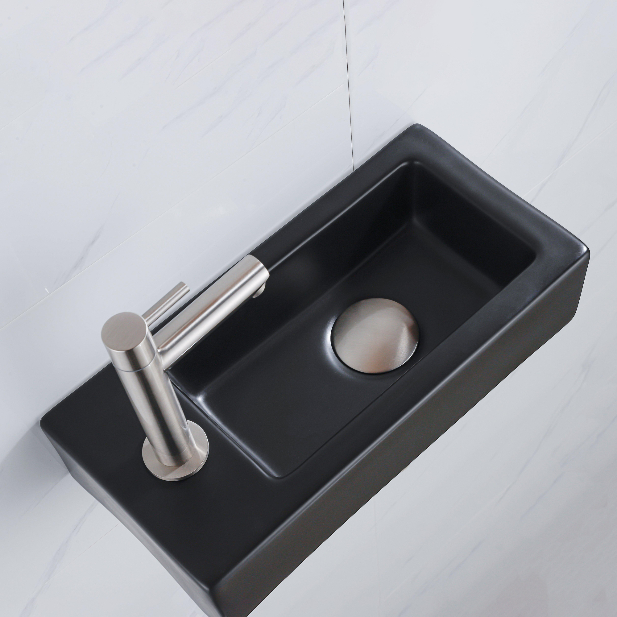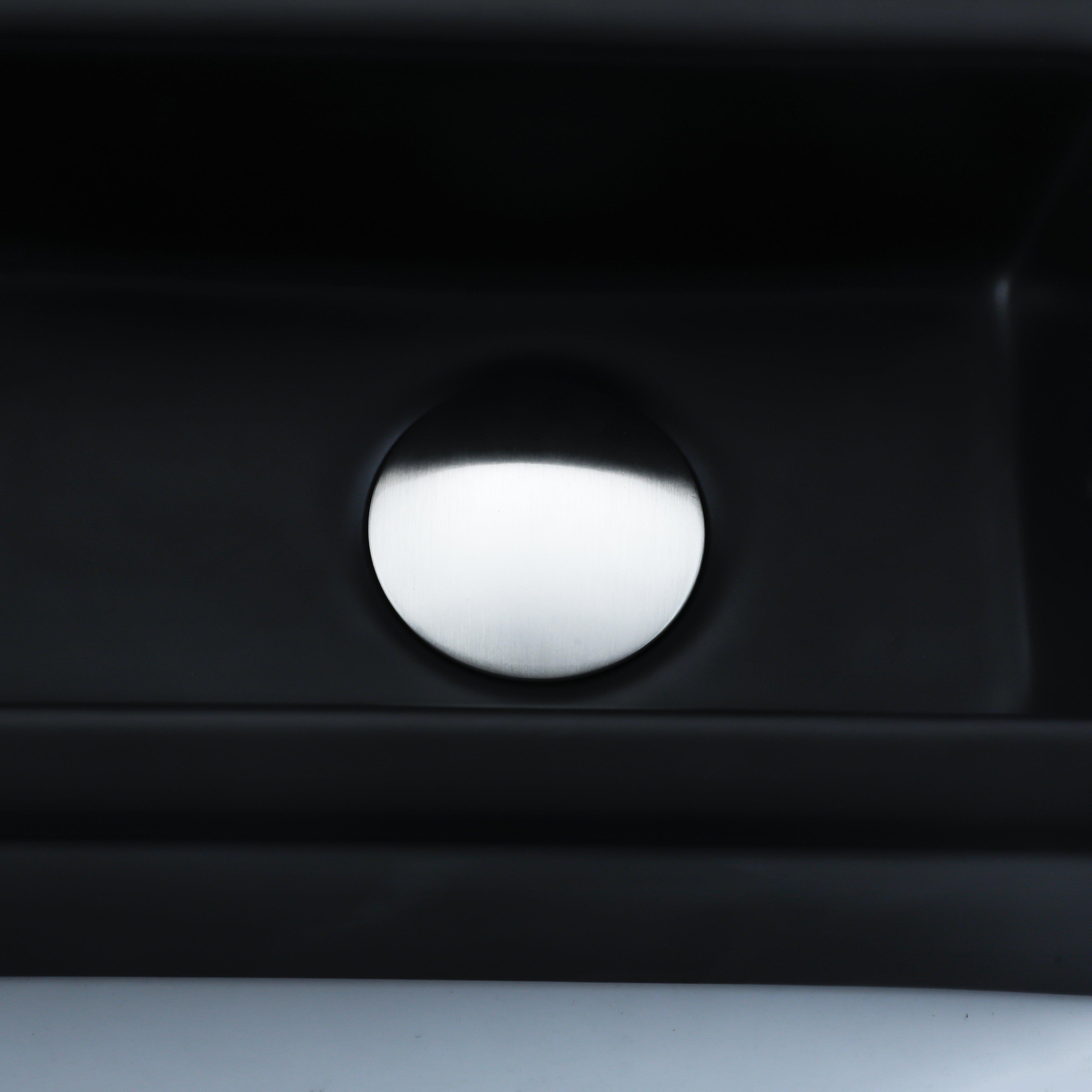 Cet ensemble de lave-mains est conçu avec un souci de modernité et de fonctionnalité. Le design épuré et la couleur noire mate s'harmonisent parfaitement avec un style de salle de bain contemporain. La combinaison de céramique et d'inox brossé donne une sensation de luxe et de raffinement, tandis que le trou de robinet à gauche assure une disposition ergonomique et pratique.