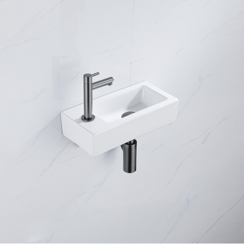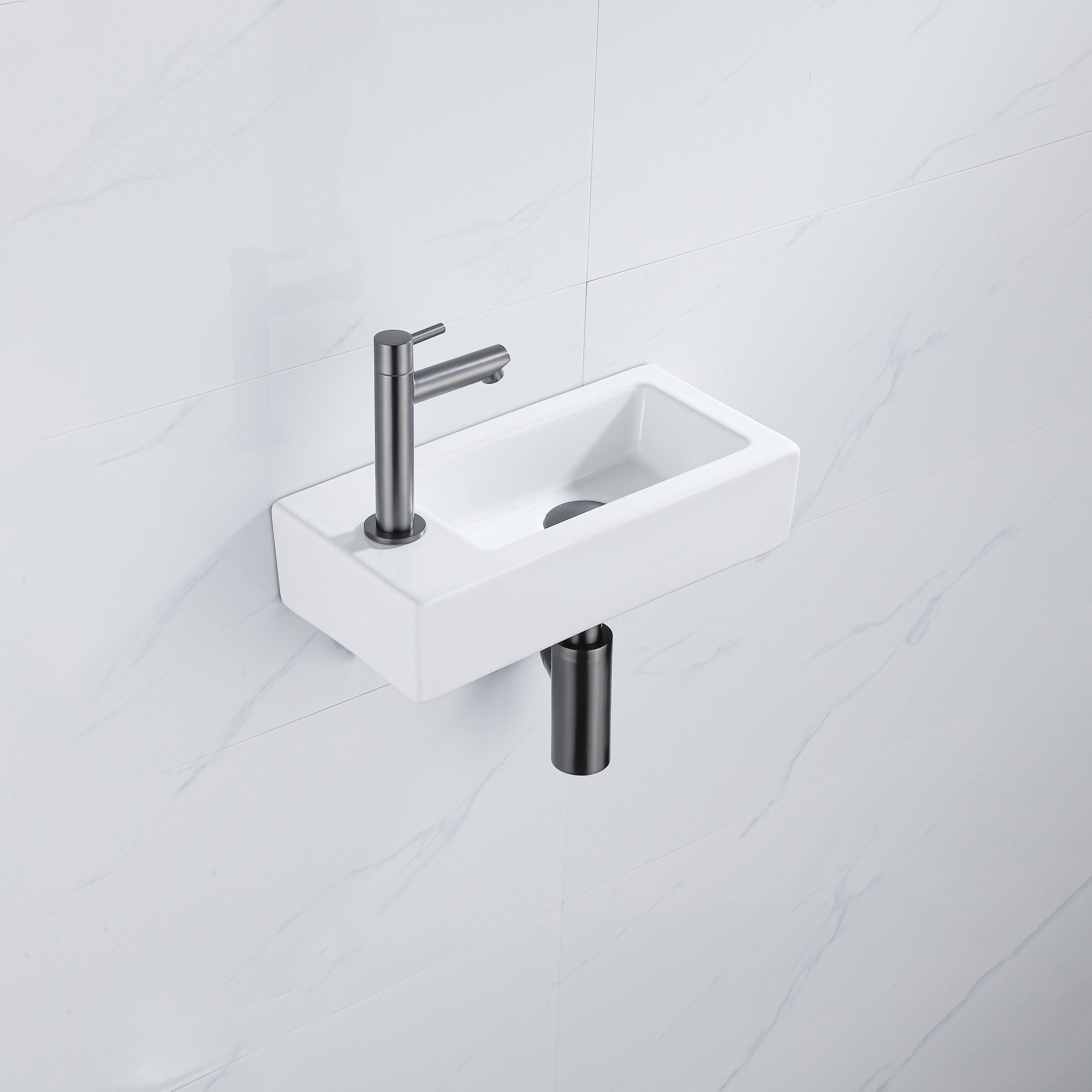 QeramiQ Fontein Fonteinset - 37.5x18.5x9cm - céramique - trou de robinet gauche - robinet lave-mains gunmetal - bonde de vidage - siphon abaissé - Brillant blanc