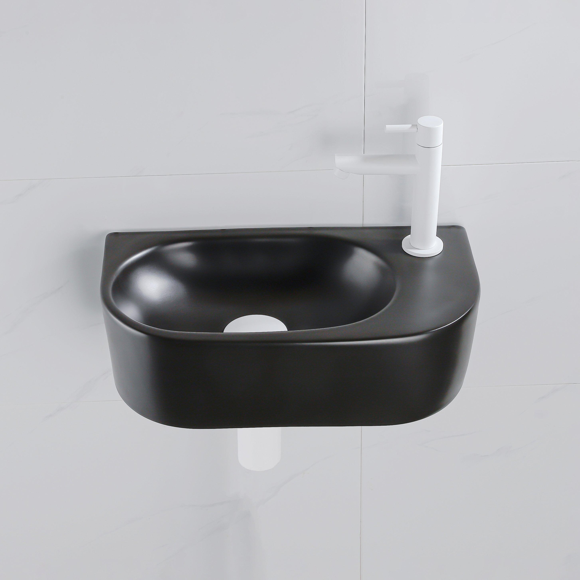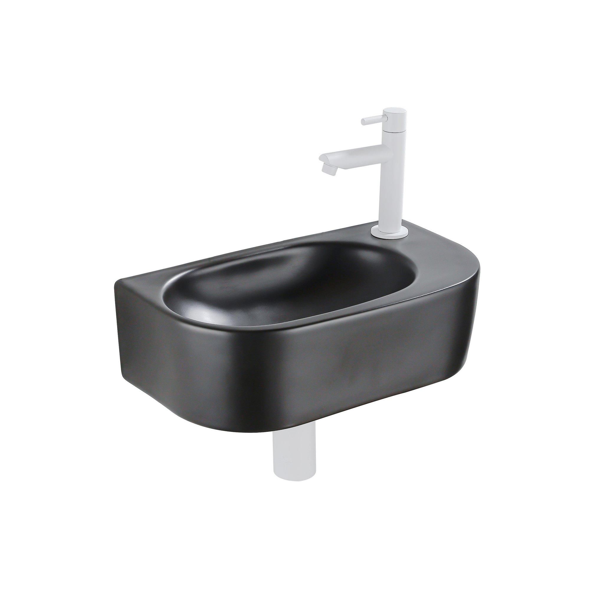 QeramiQ Fuente Ensemble de Lavabo - 40x21.5x12cm - droit - lisse - demi-rond - 1 trou de robinet - céramique - ensemble de robinet blanc mat - bouchon de vidange - siphon réduit - noir mat
