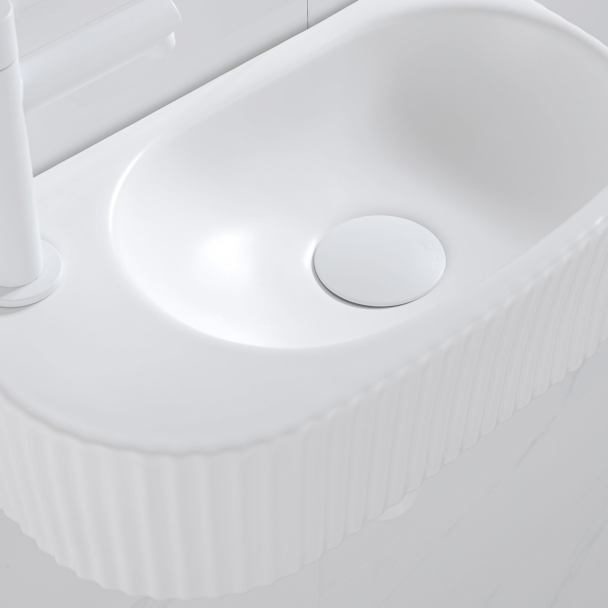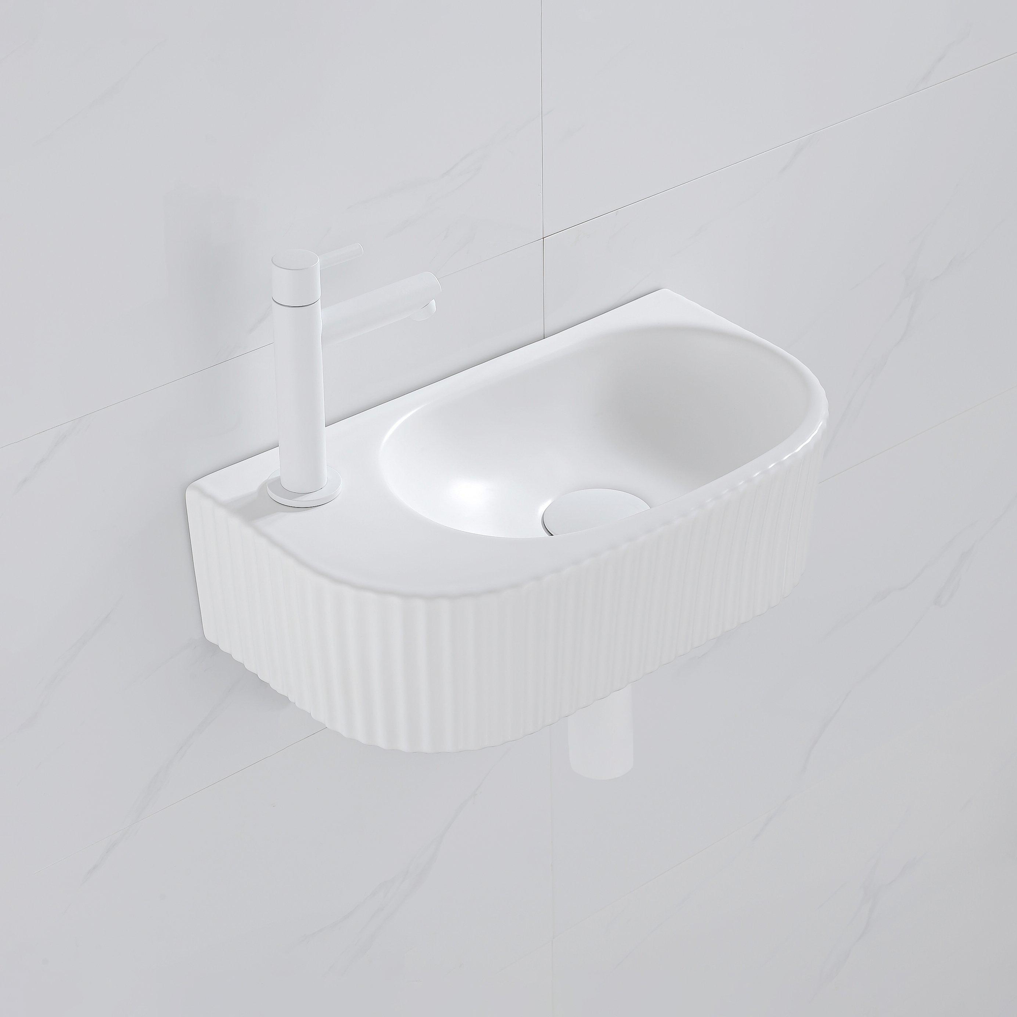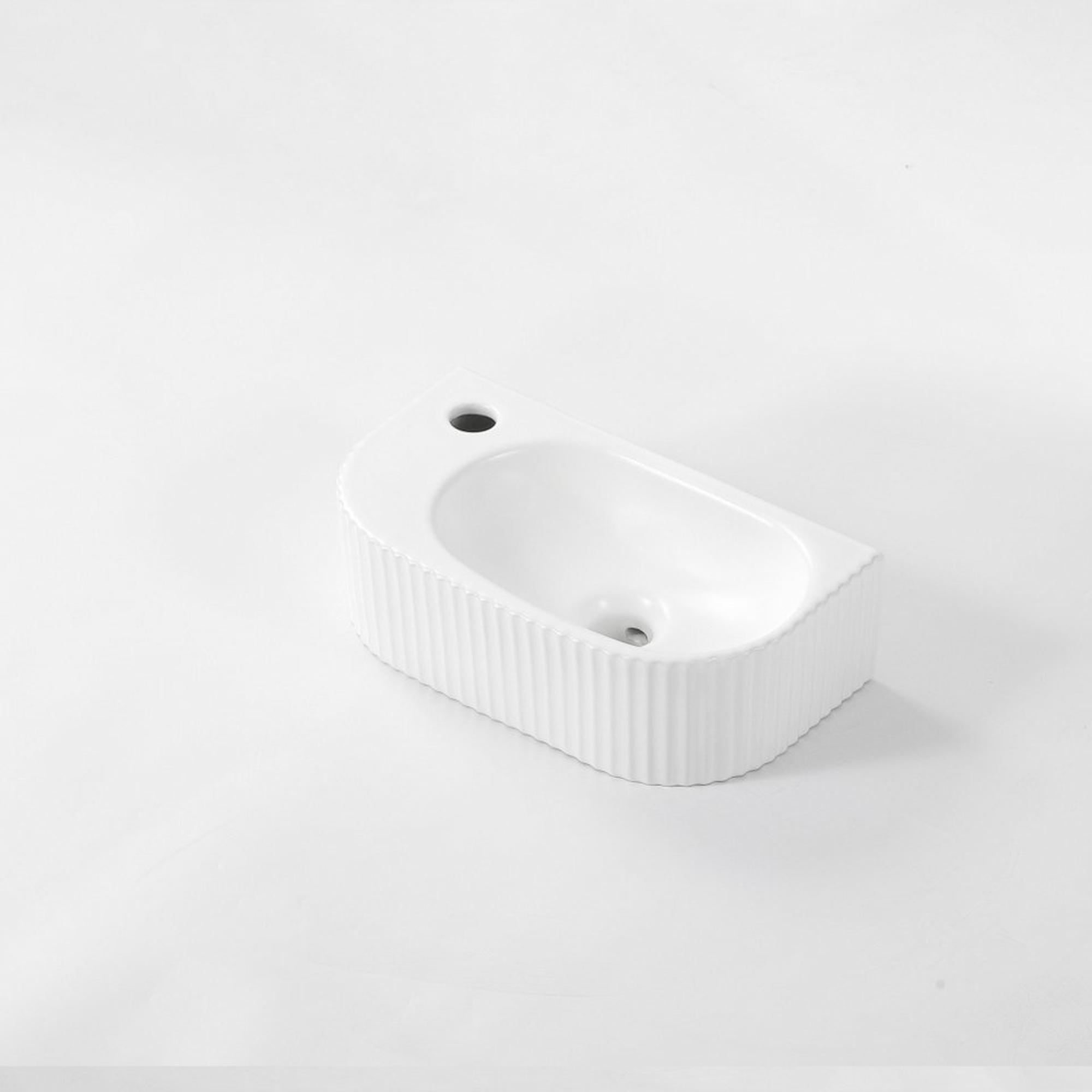 QeramiQ Fuente Ensemble de Lavabo - 40x21.5x12cm - gauche - strié - demi-rond - 1 trou de robinet - céramique - ensemble de robinet blanc mat - bouchon de vidange - siphon abaissé - blanc mat