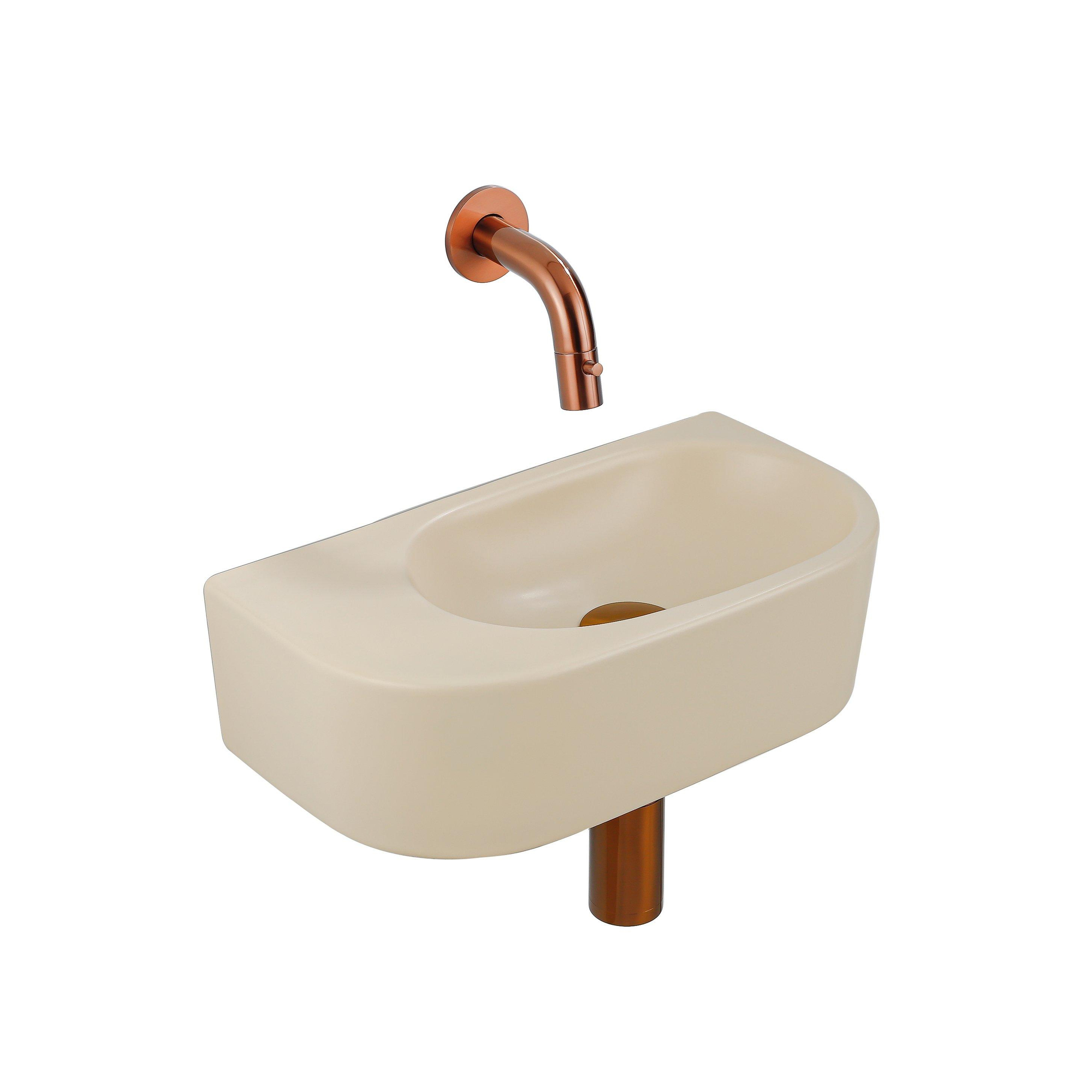 QeramiQ Fuente Ensemble de Lavabo - 40x21.5x12cm - lisse - demi-rond - sans trou pour robinet - céramique - ensemble de robinet en cuivre brossé - bouchon de vidange - siphon réduit - beige