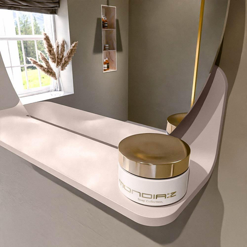 Le plan de couverture, avec ses coins arrondis fluides, offre un espace de rangement pratique pour vos besoins quotidiens. Le miroir est subtilement encastré dans le plan de couverture, ce qui donne une apparence moderne et élégante.