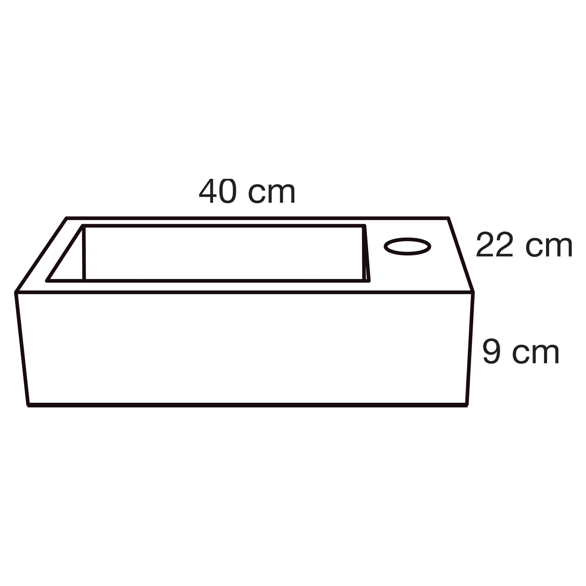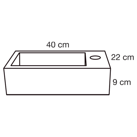 Avec une dimension de 40x22x9 cm, ce lavabo pour WC est spécialement conçu pour les toilettes compactes et les petites salles de bains. La profondeur de seulement 22 cm vous permet de conserver suffisamment d’espace de passage, même dans un couloir ou une niche étroite. Parallèlement, la cuve rectangulaire offre assez d’espace pour vous laver les mains confortablement sans éclabousser. Le trou de robinetterie à droite est idéal lorsque le lavabo est placé contre un mur latéral ou lorsque vous souhaitez positionner le robinet en dehors de la zone de passage. Vous combinez ainsi une utilisation pratique avec une apparence nette et ordonnée.